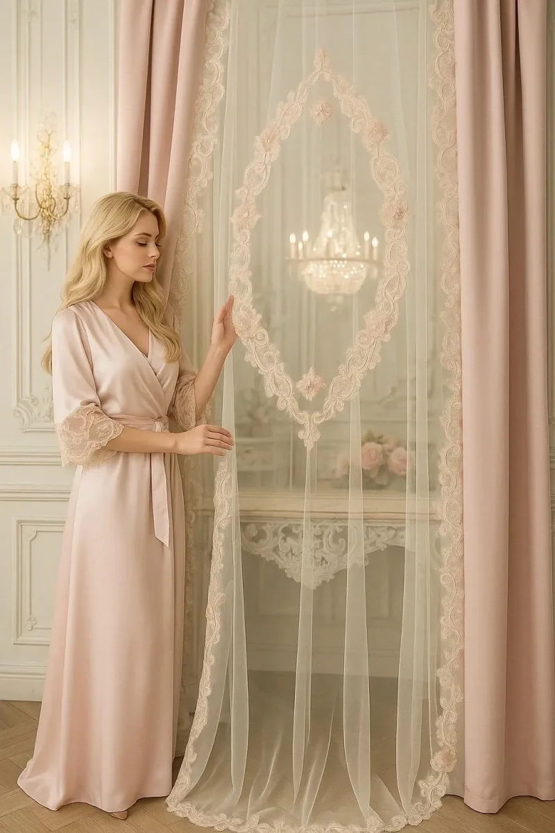 Set completo di tende a quattro teli – Rasatello e tulle ricamato bianco-perla e rosa