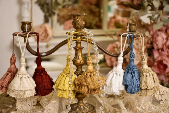 Sempre in cerca di oggetti preziosi per dare vita alle nostre collezioni di bordi, nastri, cordoni, embrasse, fiocchi per chiavi, bracciali, realizziamo nei nostri laboratori vere e proprie opere d’arte.La lunghezza totale è cm 20, solo il fiocco cm 10.