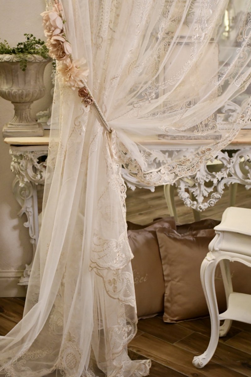 Tenda in tulle raffinato con decori, inspirata a modelli antichi della nostra tradizione. Decori di volute stile liberty beige