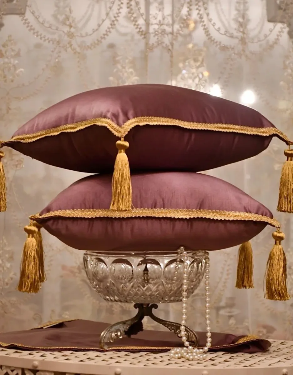 Cuscini di lusso, realizzati in raffinato raso di seta color viola cattedrale, sono ornati da bordature dorate che donano un’eleganza senza tempo.