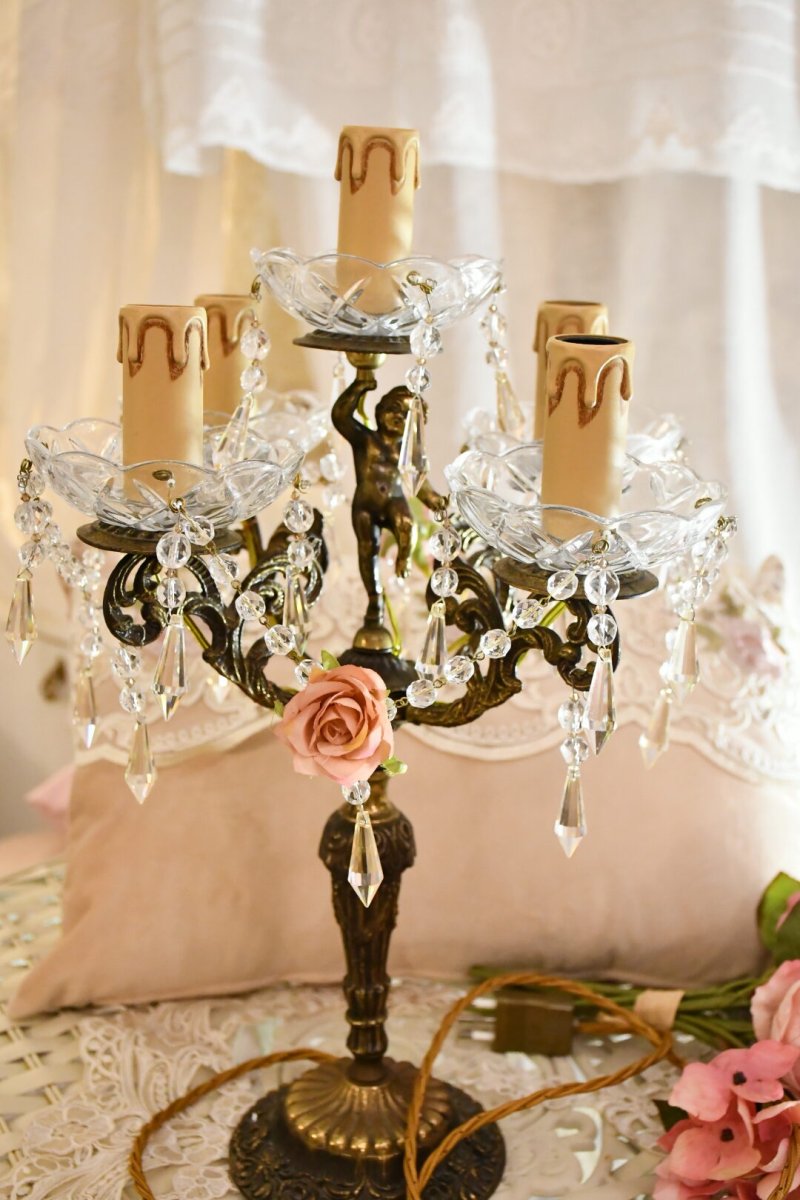 Lampada da tavolo del 1940 italiana .La struttura é in bronzo patinato con 5 bracci di cui 1 ,quello centrale con un angioletto.Ha 5 bobeche in cristallo con collanine e pendenti.