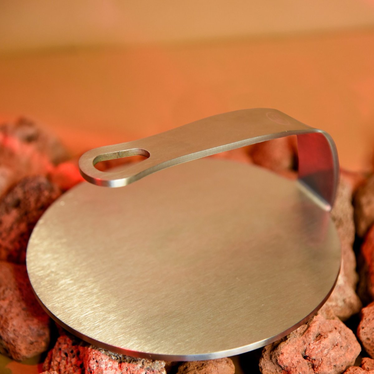 Pressa ChefPress 304 progettata per compattare burger e carni alla griglia. Realizzata in acciaio inox AISI 304, garantisce pressione uniforme e controllo durante la cottura su BBQ.