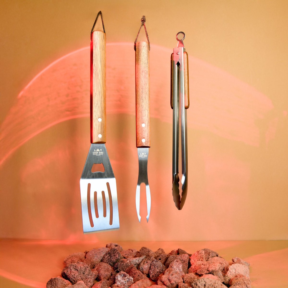 ChefTools – Utensili per barbecue in acciaio inox e legno di acacia – 3 pezzi/set