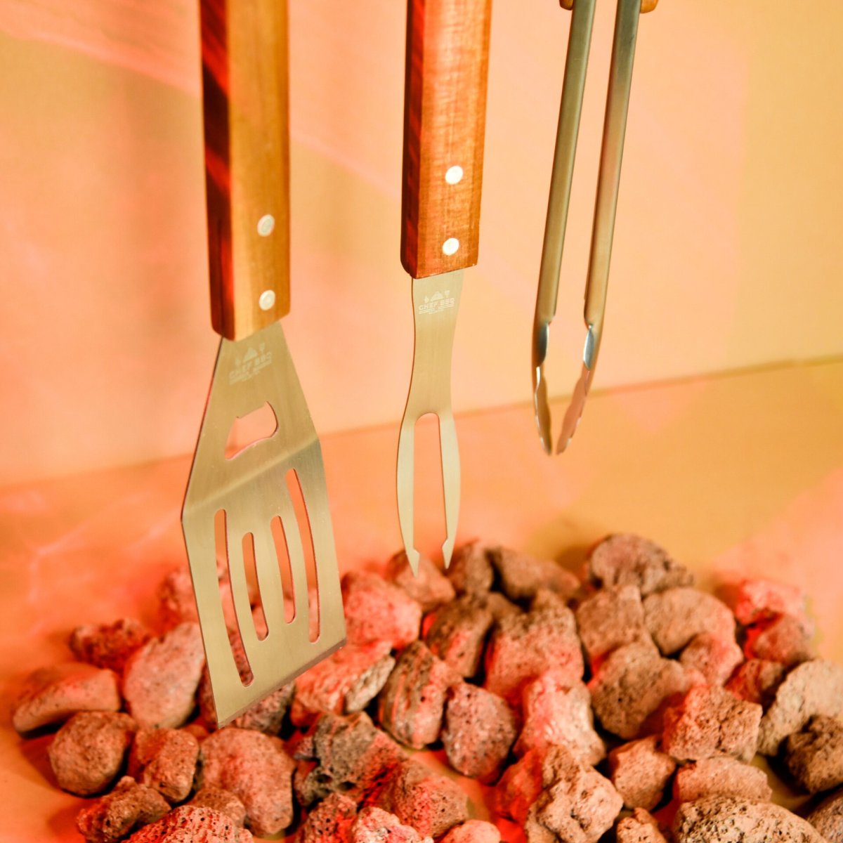 Set ChefTools composto da tre utensili BBQ con corpo in acciaio inox e manici in legno di acacia. Pensato per una gestione completa della griglia, unisce funzionalità e materiali naturali. Ideale per chi cerca strumenti essenziali, solidi e ben bilanciati.