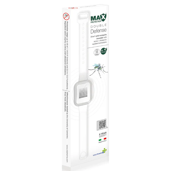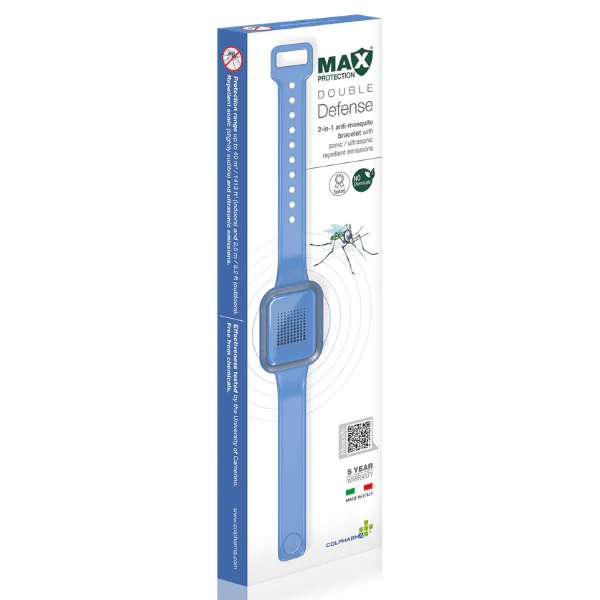 Il braccialetto antizanzare da polso DOUBLE DEFENSE COLPHARMA® utilizza 2 tecnologie repellenti: emissioni variabili soniche (leggermente udibili con 2 livelli di intensità ) o ultrasoniche (non udibili). L’antizanzare è molto potente e la sua efficacia è stata testata dall’Università degli Studi di Camerino.