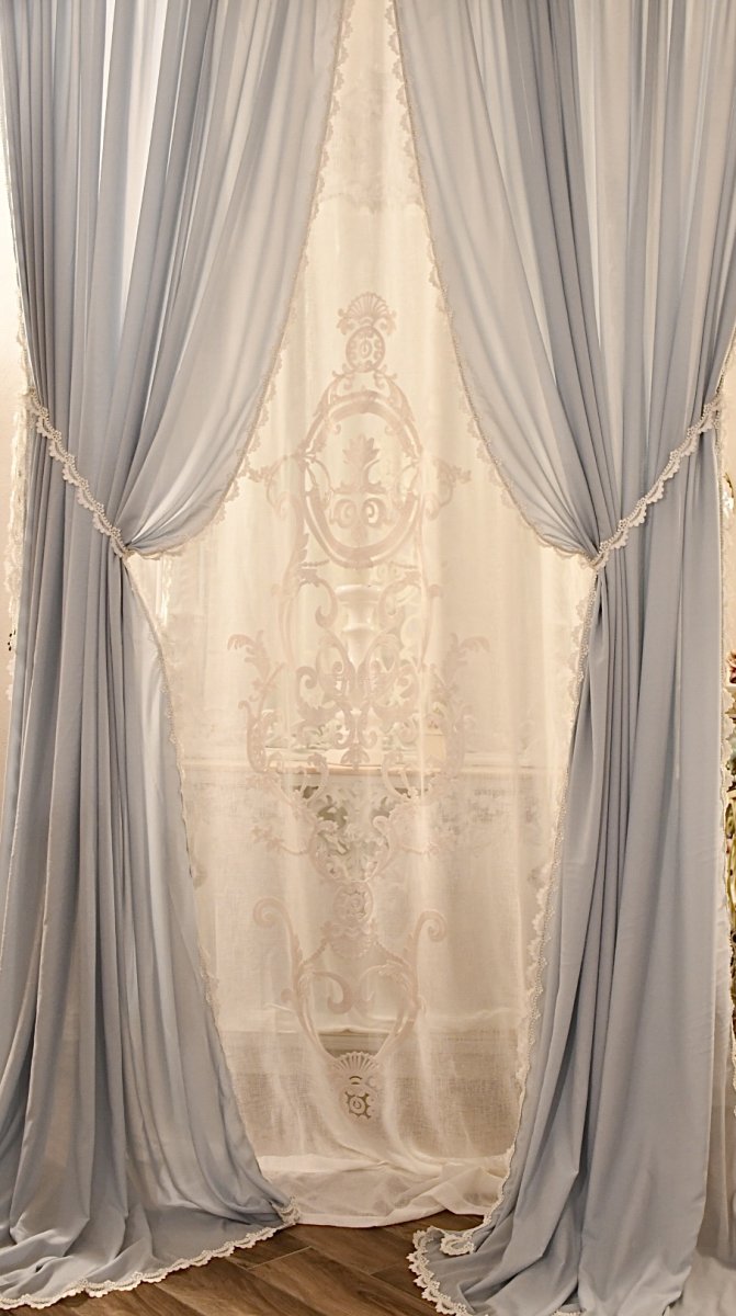 “Benvenuti nel mondo dell’eleganza senza tempo e dell’artigianato italiano di alta qualità. Il nostro completo tende in georgette azzurro polvere e lino intarsiato è una testimonianza della maestria artigianale che solo l’Italia può offrire. Ogni dettaglio di questo capolavoro è stato realizzato a mano nei nostri laboratori di sartoria, dove i nostri esperti artigiani lavorano con passione e dedizione. La georgette azzurro polvere dona a queste tende un’eleganza delicata e un tocco di romanticismo, mentre il lino intarsiato aggiunge un elemento di raffinatezza. I tessuti e i merletti pregiati italiani utilizzati sono il risultato di secoli di tradizione tessile, garantendo qualità e bellezza senza pari.Ogni pezzo è unico, creato su misura per soddisfare le vostre esigenze e il vostro stile personale. Questo completo tende è l’emblema dell’arte sartoriale italiana, dove la bellezza, la tradizione e la maestria si fondono in un unico prodotto. Portate a casa un pezzo di autentica eleganza italiana con le nostre tende in georgette e lino intarsiato, e trasformate il vostro spazio in un’oasi di stile senza tempo.”Completo tende Riceverai 2 tende in georgette azzurro polvere rifinite su tutti i lati con un merletto delicato color bianco seta ogni pannello misura cm 250 di larghezza (inches 98,42) per altezza a scelta e 1 pannello centrale in misto Lino bianco seta con decori trasparenti di misura larghezza cm 150 (inches 59,05”) per altezza a scelta Il pannello centrale in misto Lino ha una fettuccia per i gancetti per binario e fiocchi per annodare e le due tende in georgette rosa hanno un asola per inserire un qualsiasi palo , ma se desideri la fettuccia per binario non esitare a scriverlo .