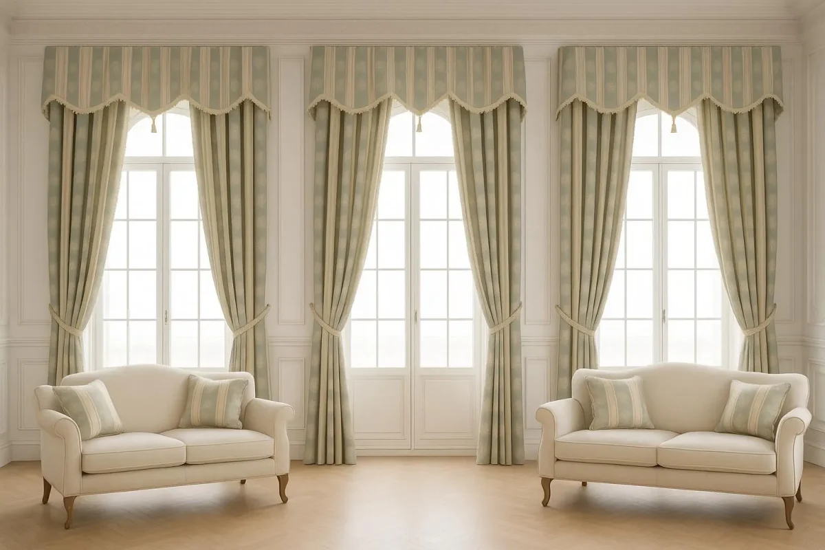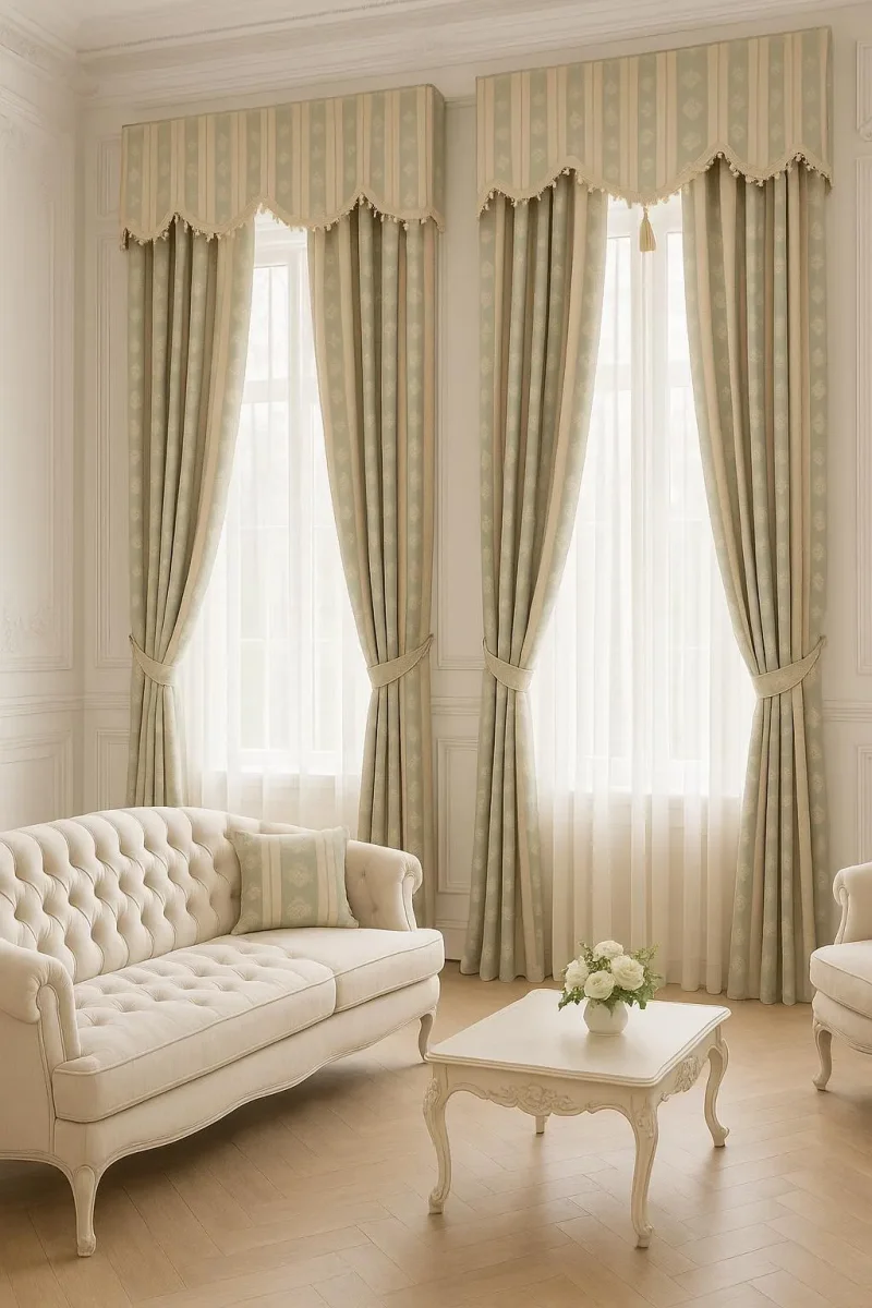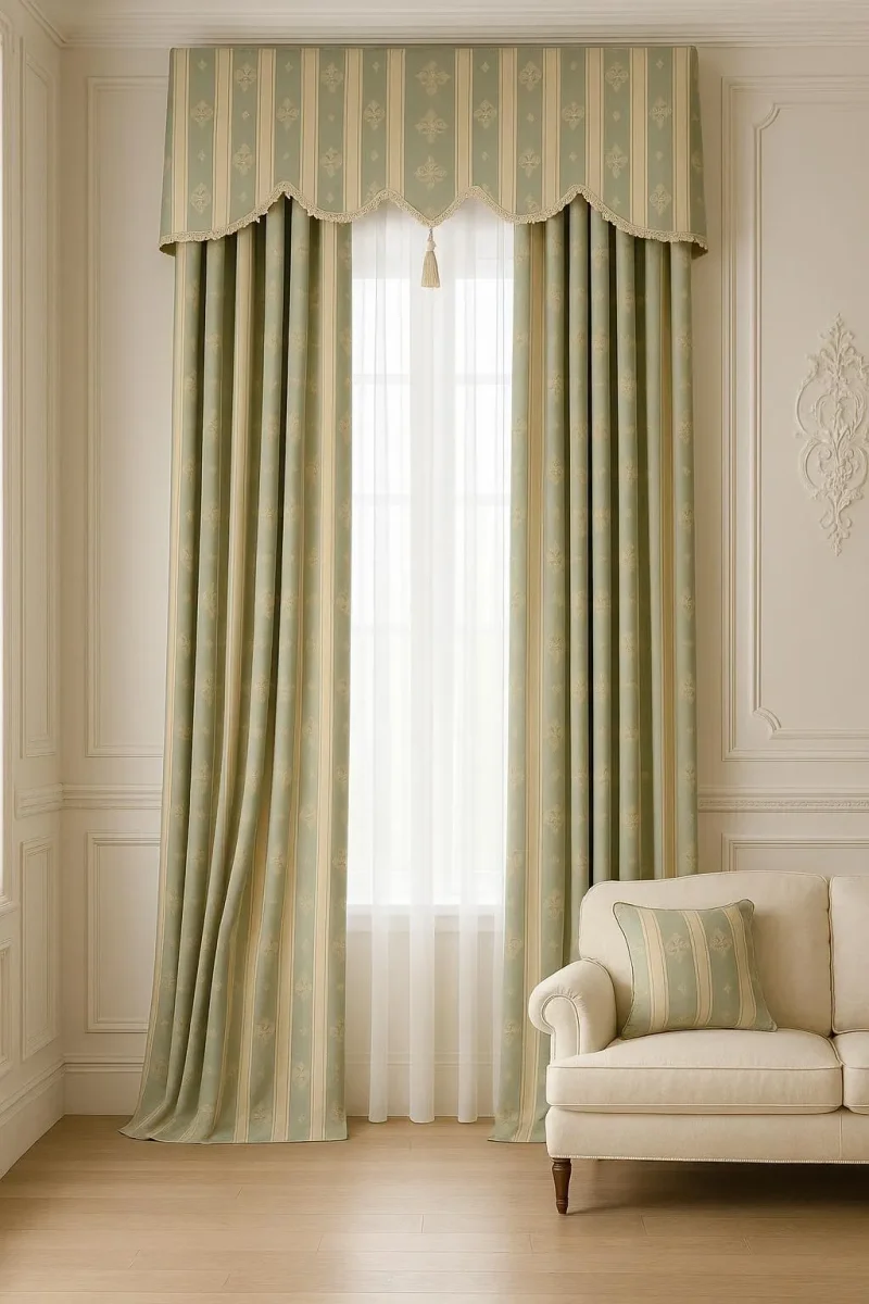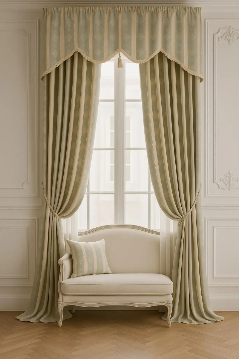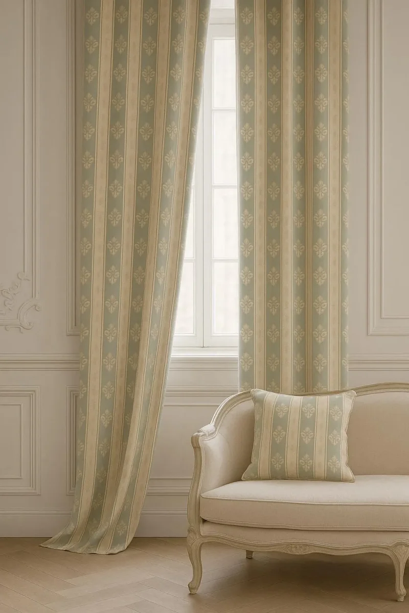 L’insieme è armonioso e ben bilanciato: le righe verticali slanciano la tenda e ne esaltano l’altezza, mentre i dettagli decorativi conferiscono un’impronta elegante e senza tempo, perfetta per ambienti aristocratici e ricercati.Si lavano in lavatrice senza restringimenti , anzi il tessuto diventa sempre piú bello e morbido ad ogni lavaggio.