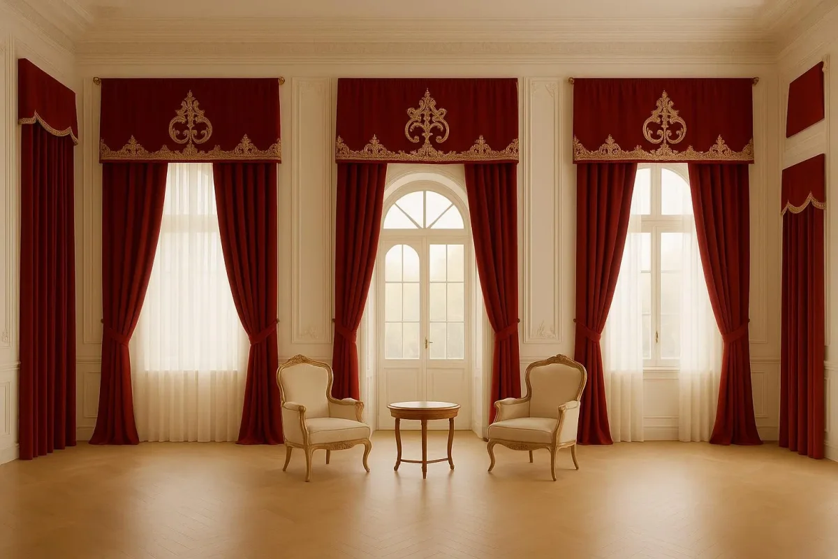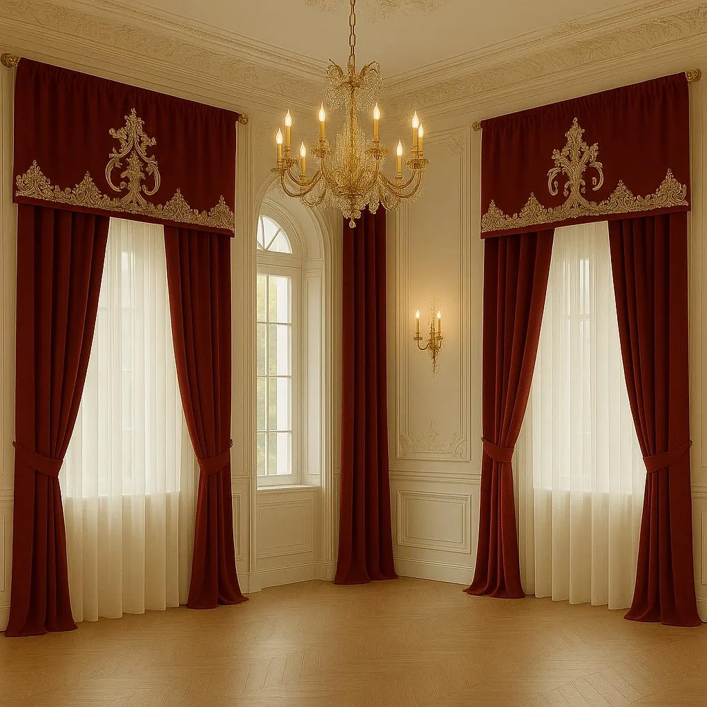 Stile: perfetto per ambienti neoclassici, aristocratici o palazzi storici, ma anche per residenze moderne che desiderano un tocco scenografico. Il velluto Bordeaux trasmette calore e imponenza, mentre il pizzo rebrodé aggiunge preziosità e delicatezza.