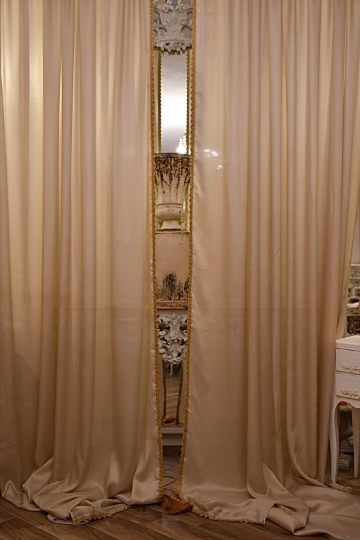 Coppia di raffinate tende oro pallido lurex, un tessuto leggero ma corposo di un effetto stupefacente per le tue feste. Se ordini 1 riceverai 2 pannelli, nella parte superiore hanno un asola di 8 cm per l’inserimento di qualsiasi bastone, e sopra un volantino. Hanno una passamaneria di lusso montata su due lati interni e nella parte inferiore. Non esitate a contattarci per qualsiasi misura personalizzata .Nell’elenco delle misure la prima misura é la larghezza la secon