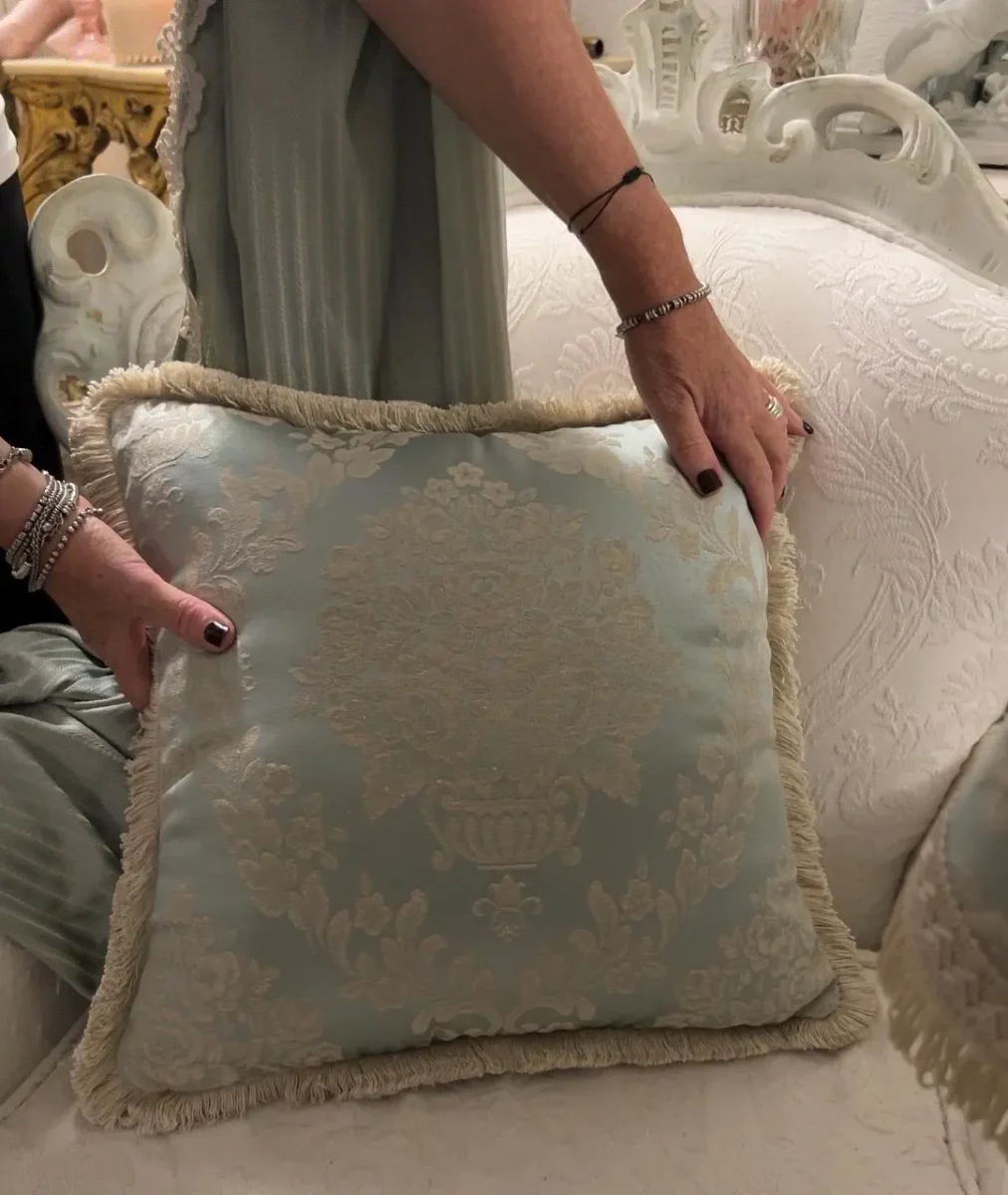 Questi eleganti cuscini in damasco di rasatello di cotone, rigorosamente *Made in Italy* e realizzati a mano nei nostri laboratori, sono il simbolo dell’artigianato italiano di alta qualità. Il tessuto, di ispirazione *royal style*, si distingue per il suo colore raffinato Azzurro Tiffany, perfetto per aggiungere un tocco di classe a qualsiasi ambiente, sia esso classico o moderno.SI VENDE SOLO FODERA.
