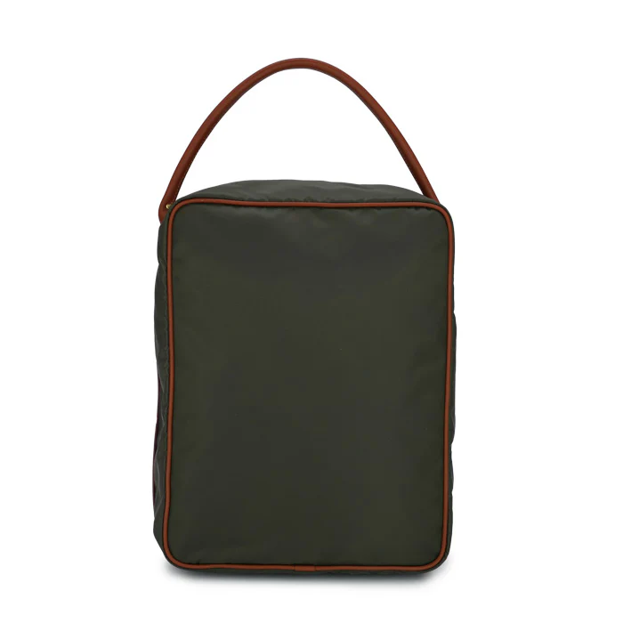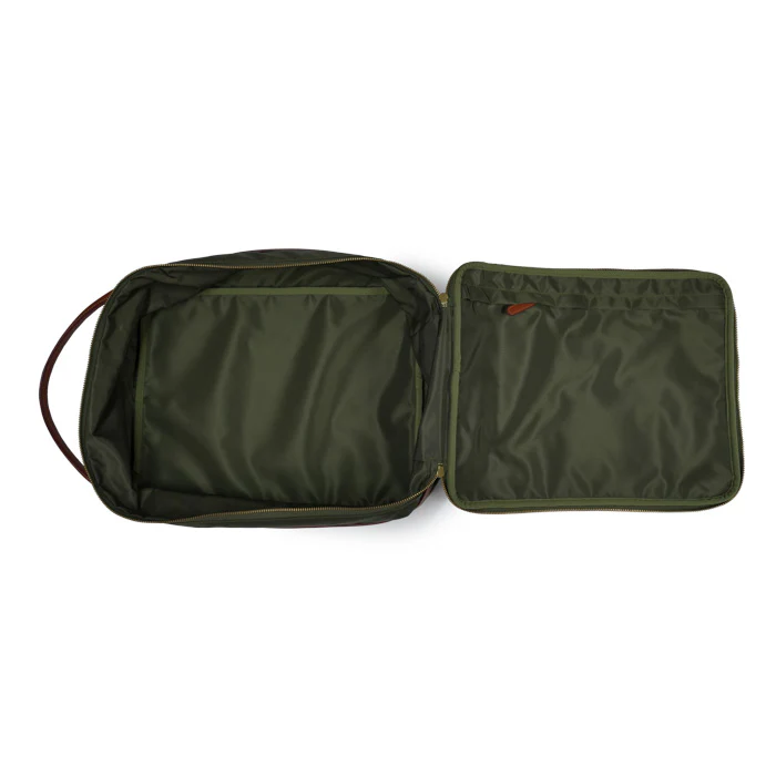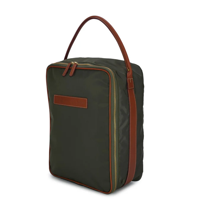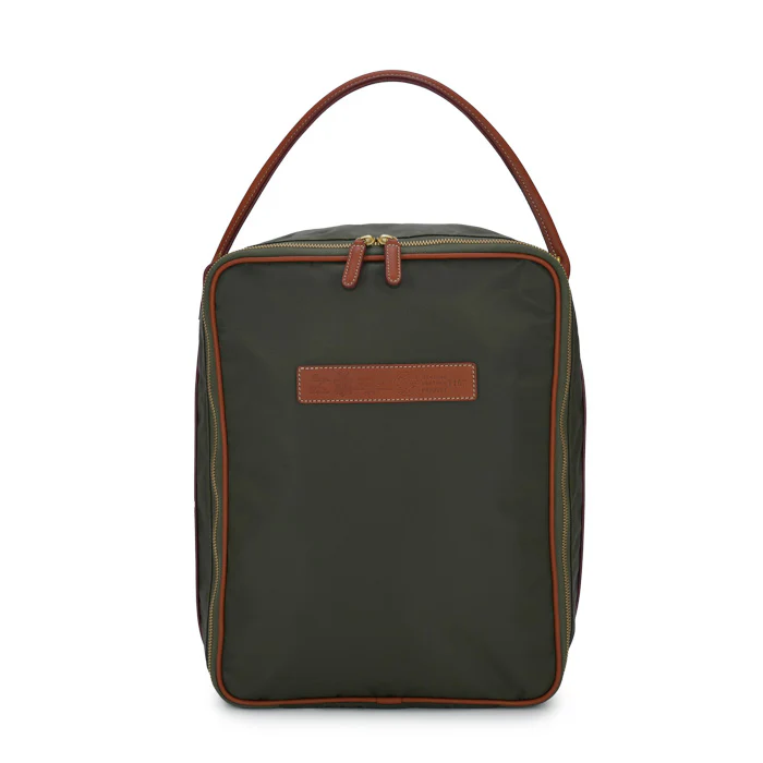 Beauty porta scarpe di Felisi realizzato in nylon tecnico colore verde militare con finiture in pelle di vacchetta colore chiaro.