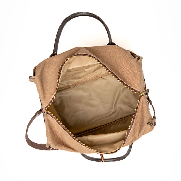 Valigia Ginevra di Felisi a doppia portata in canvas naturale di cotone beige e fodera in nylon tecnico in tinta per essere più leggera.