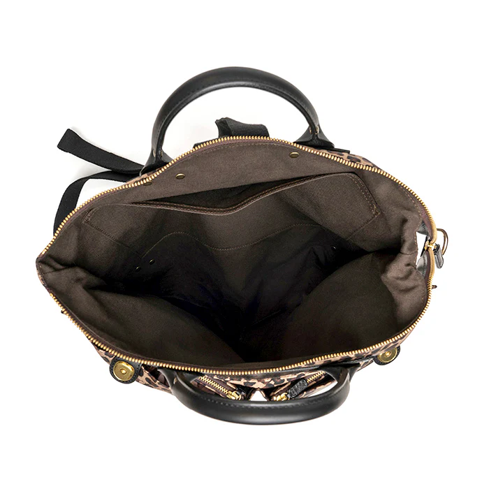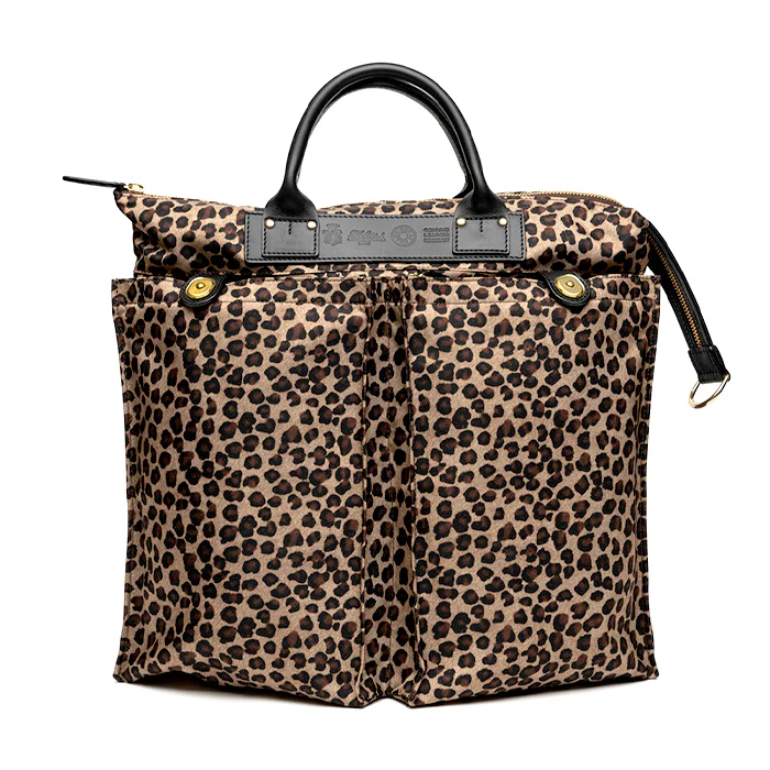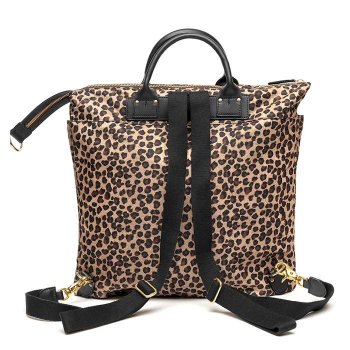 Realizzato in nylon tecnico leopard e finiture in pelle di vacchetta resistente colore nero.