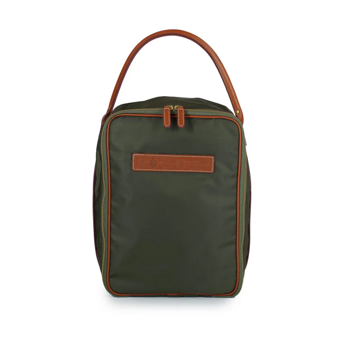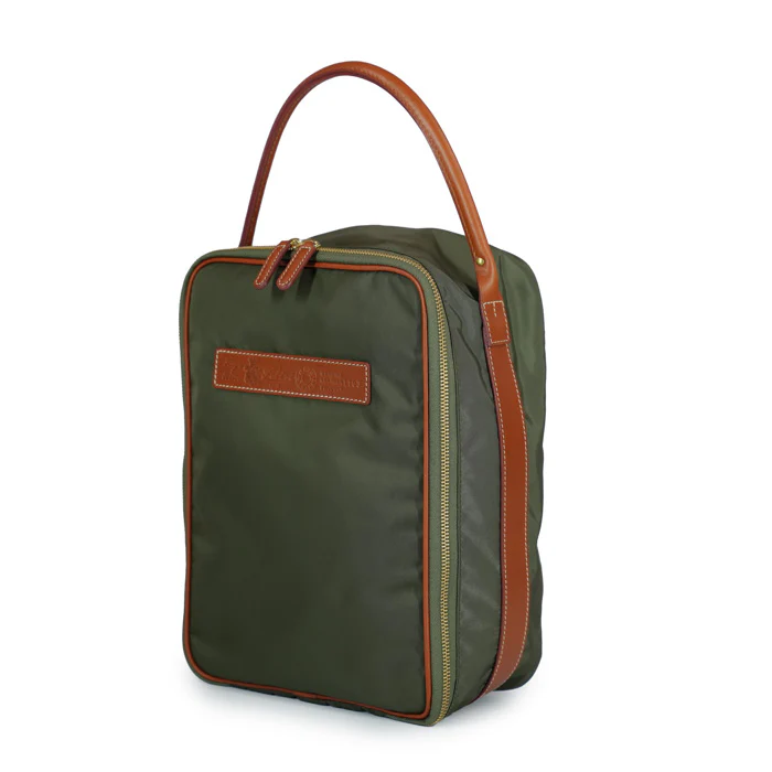 Il porta scarpe Jonathan di Felisi è realizzata in nylon tecnico colore verde oliva con finiture in pelle di vacchetta colore chiaro.