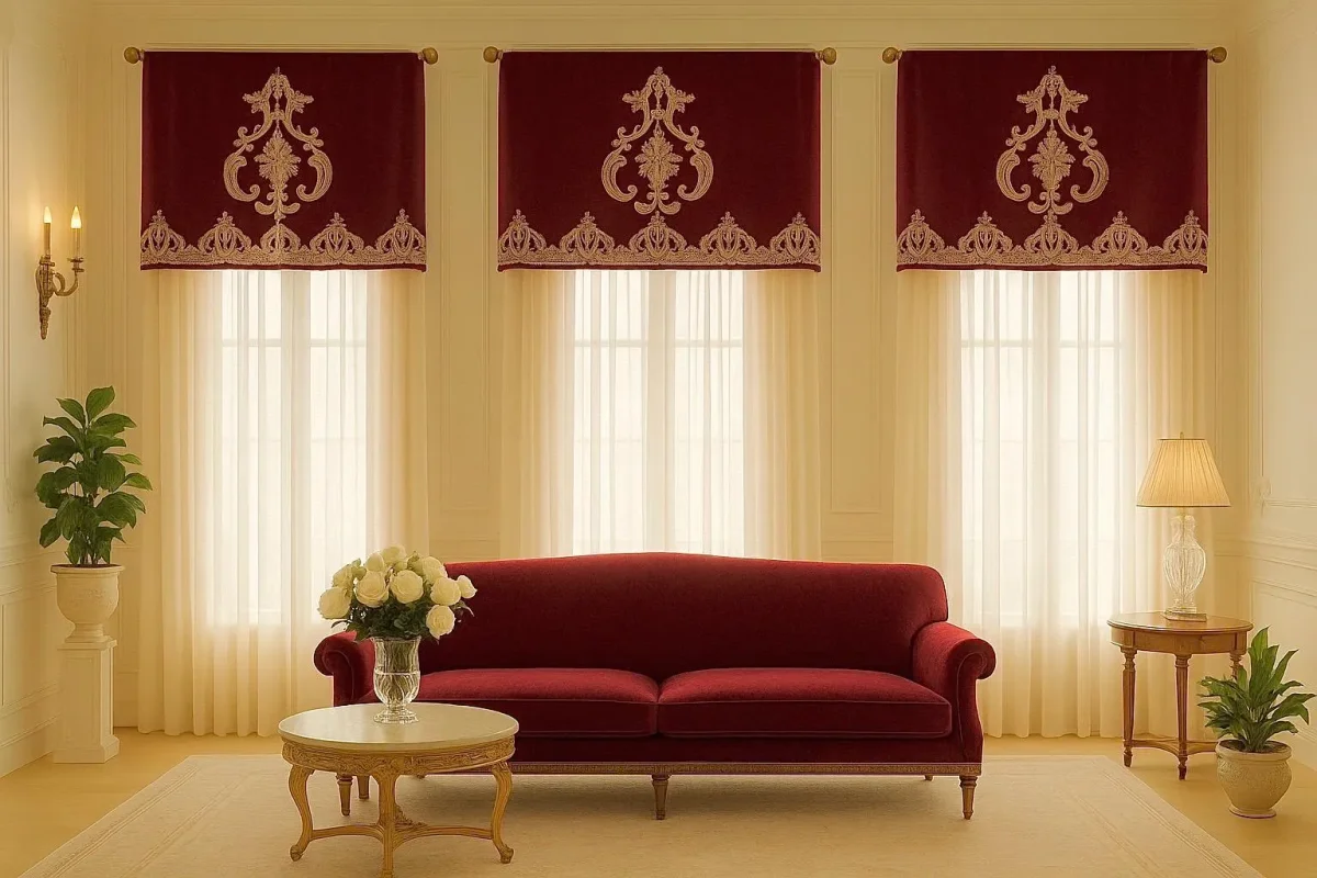 Questa raffinata mantovana è realizzata in velluto bordeaux intenso, con un taglio dritto e deciso ispirato allo stile neoclassico francese, perfetta per valorizzare finestre eleganti e raffinate.