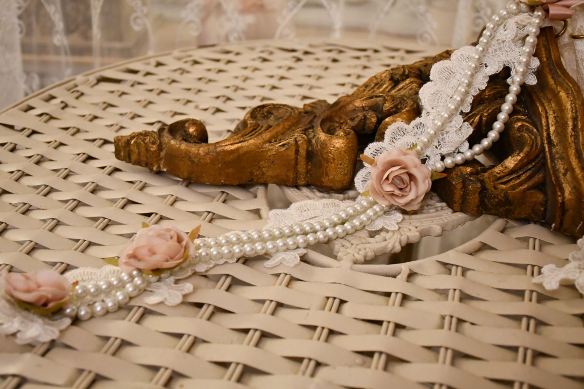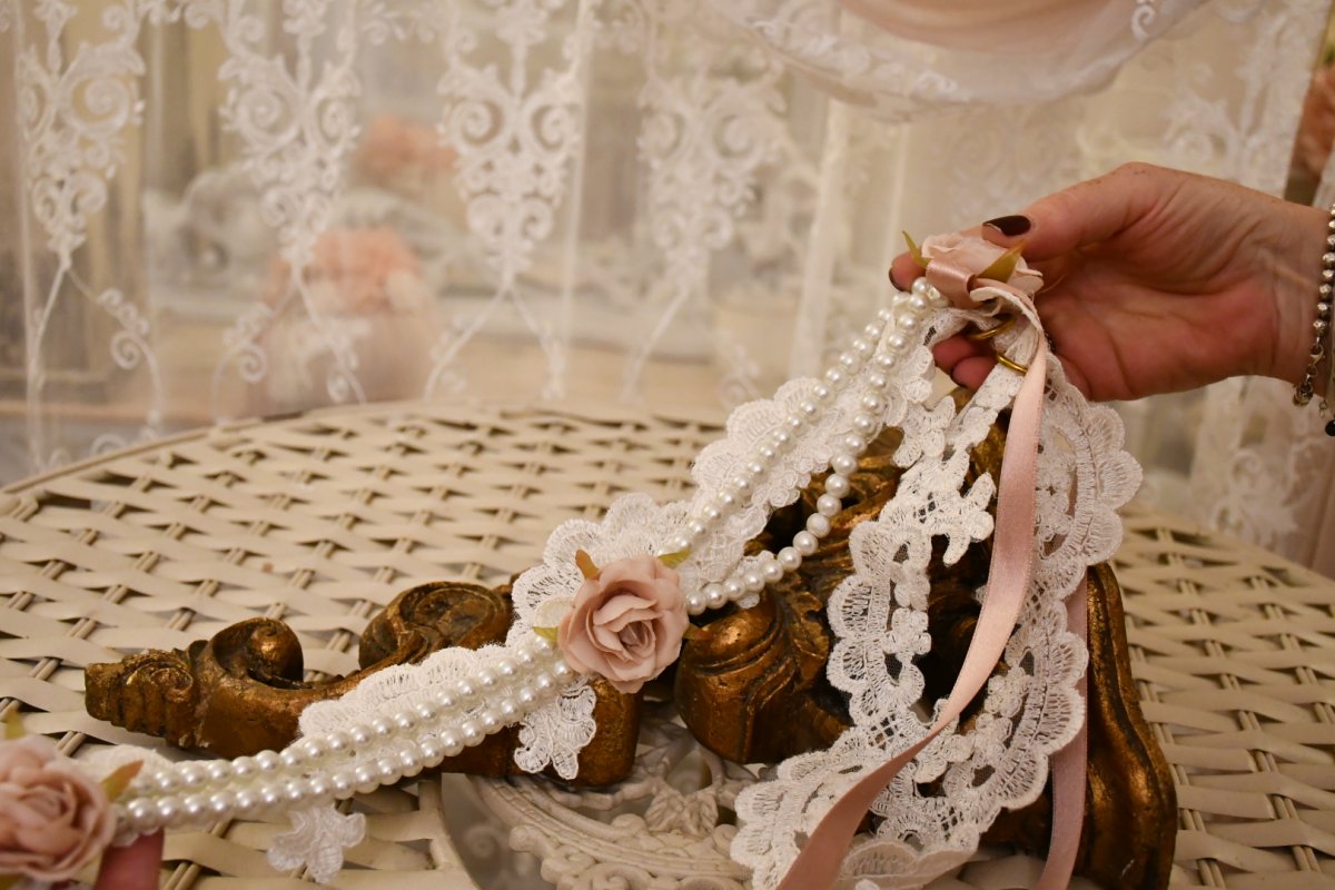 Interamente in pizzo colore bianco avorio su cui sono cucite perle e fiori .Renderà qualsiasi tenda una meraviglia per gli occhi.