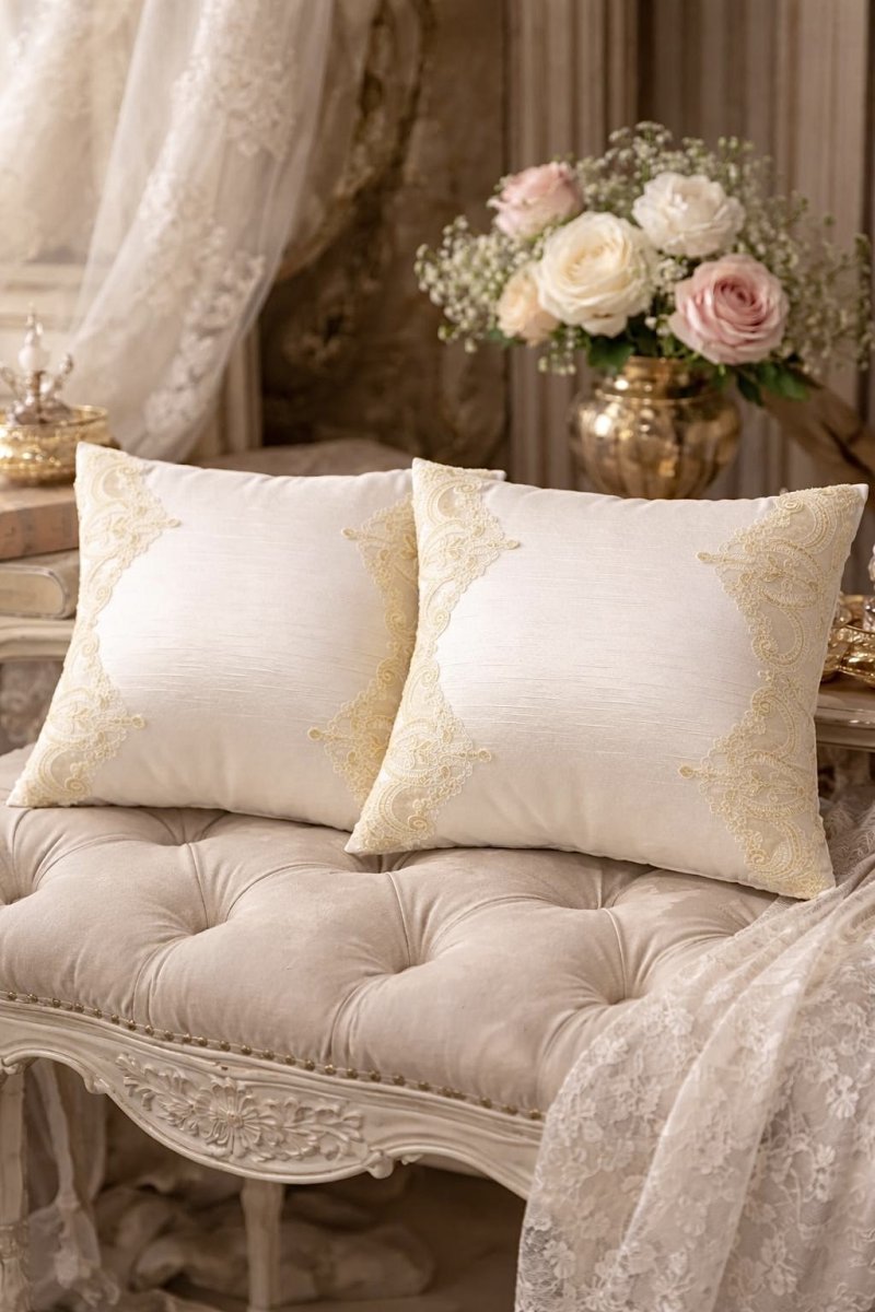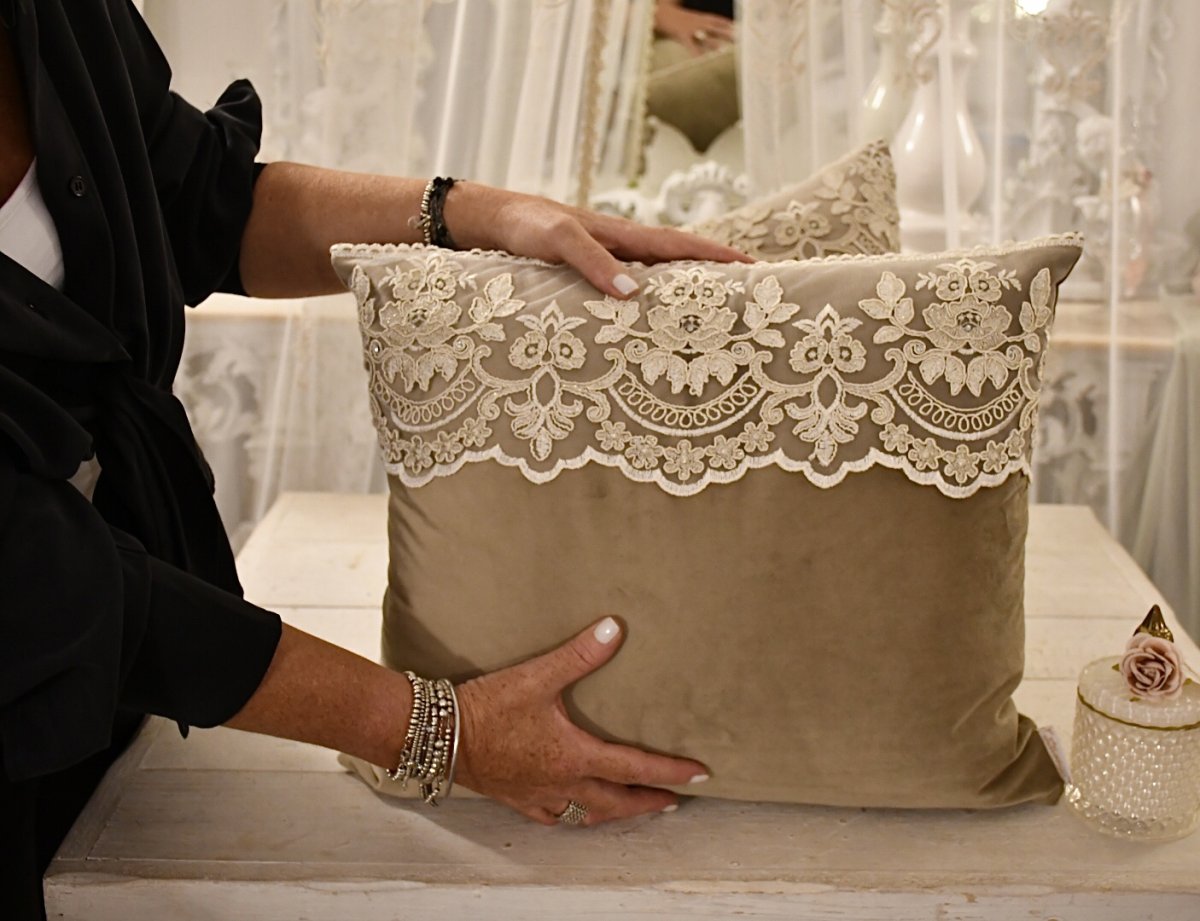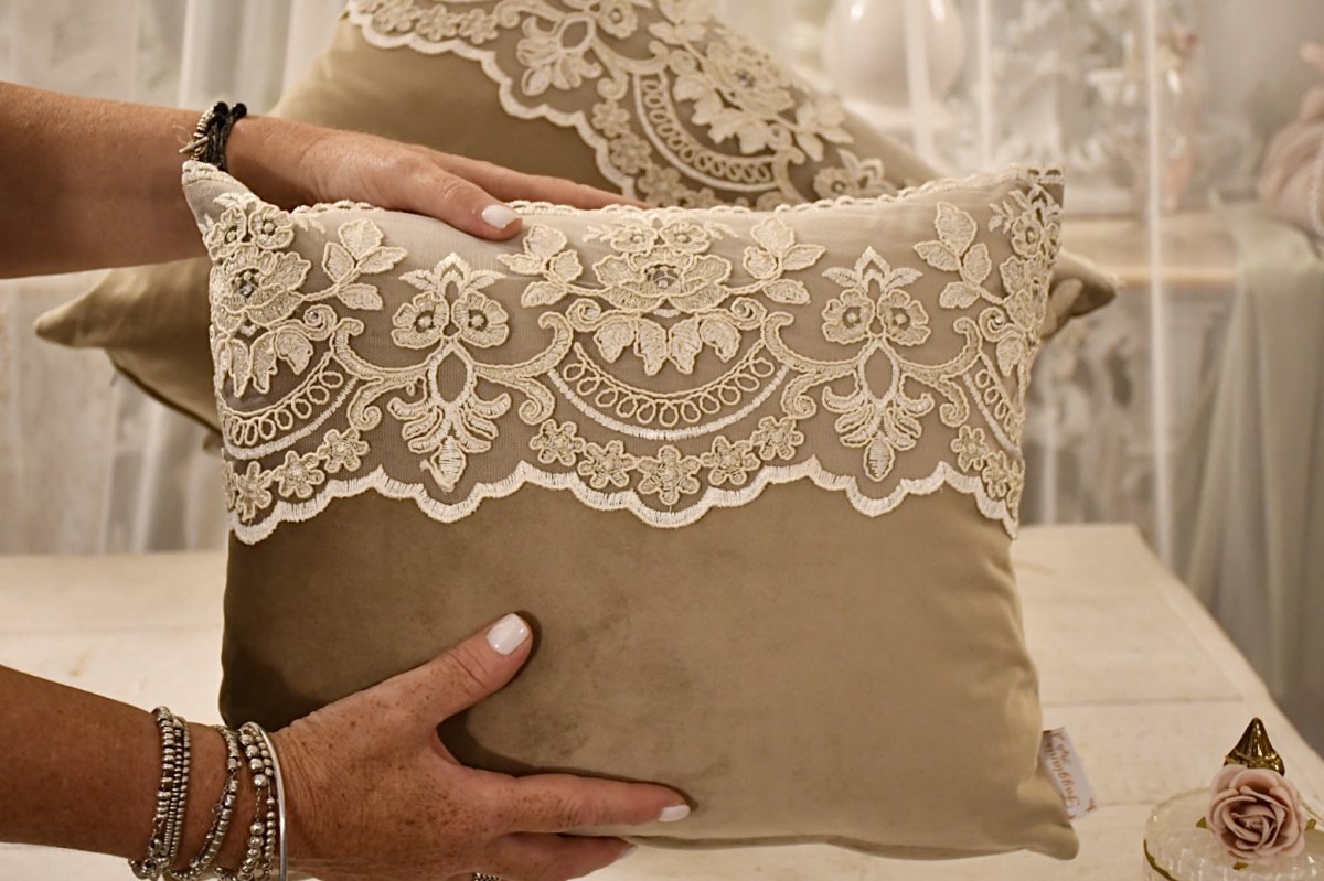 Delizioso cuscino in velluto italiano bronzo/oro e merletto rembrodé beige con filamenti oro e piccoli brillantini .
