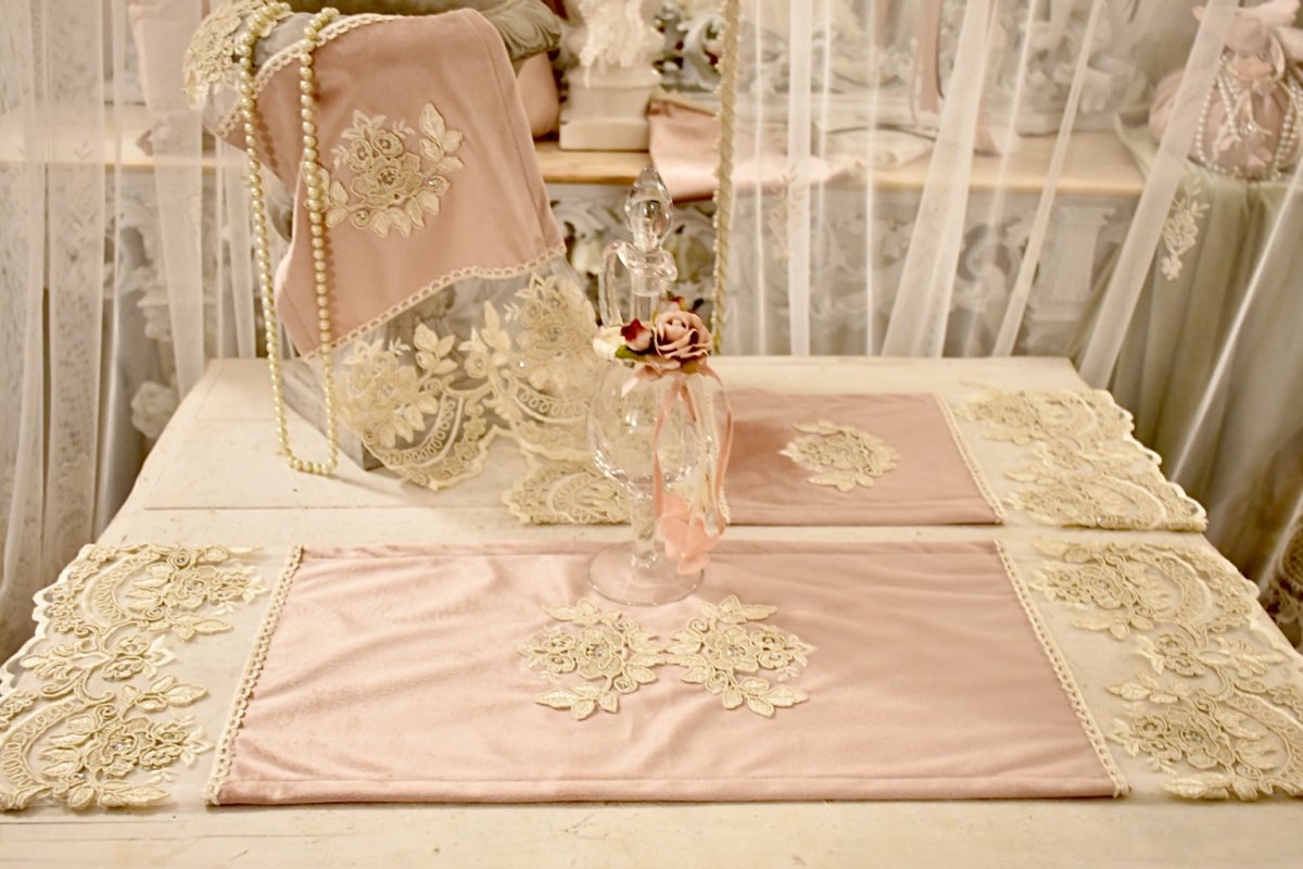 Delizioso tris di centri .Se ordini 1 riceverai 2 centrini, 1 di misura cm 80×27 e 2 , di misura cm 50×25 in velluto italiano rosa e merletto rebrodè beige con filamenti oro e piccoli brillantini .