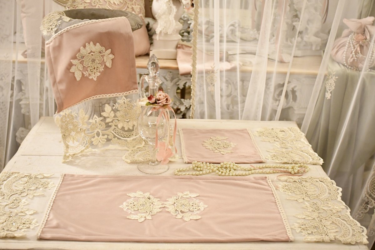 Di un colore rosa delizioso e romantico.Trasmette un senso di calma e serenità e, anche per questo, é una delle scelte più popolari nel campo dell’interno design.Si adatta perfettamente a ogni stile , da quello più moderno e minimalista a quello più glamour e chic, abbinato poi al merletto beige con piccole sfumature oro diventa di un eleganza senza tempo.