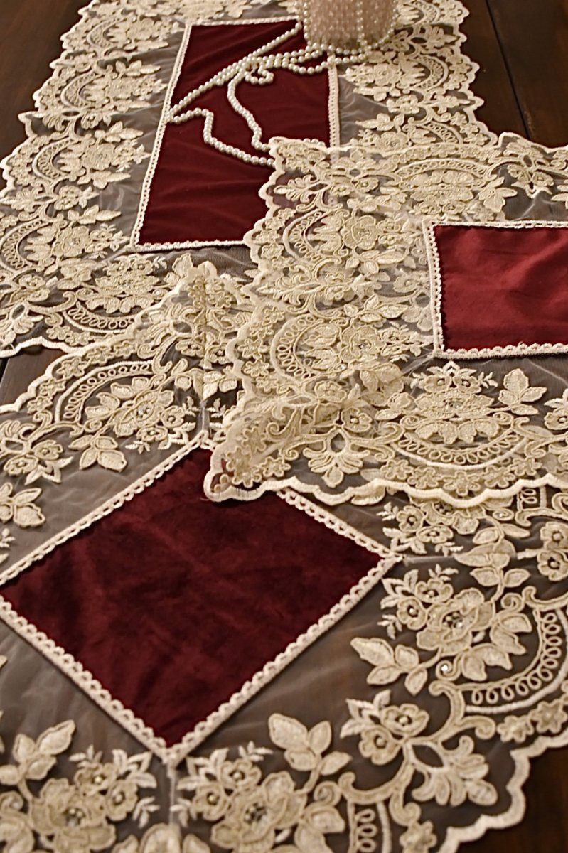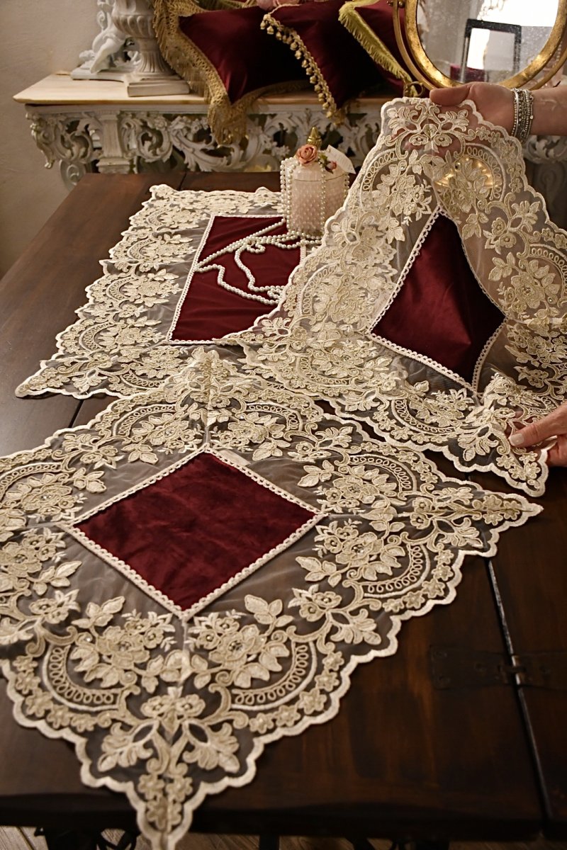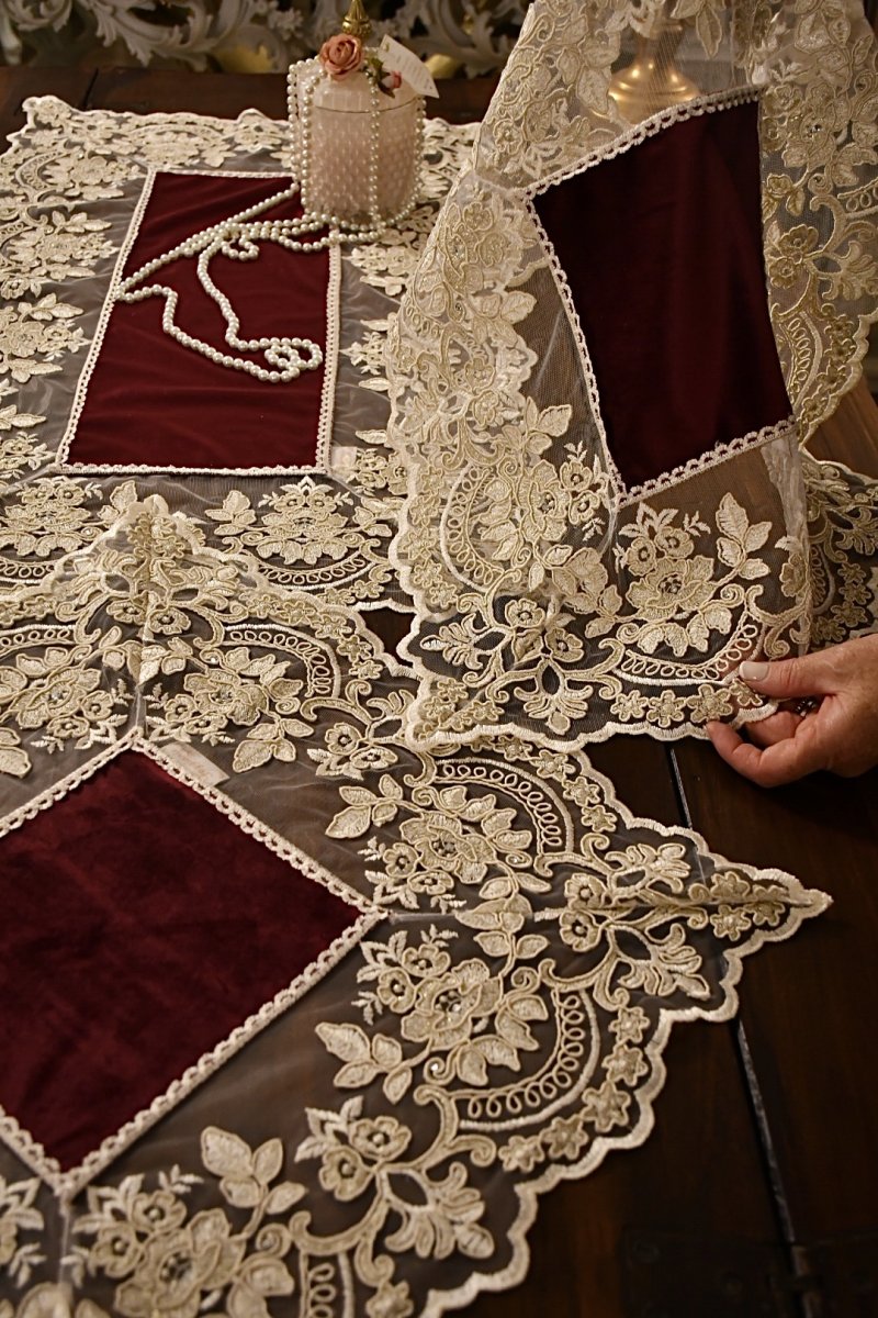 Se ordini 1 riceverai 2 centrini, 1 di misura 50×80  e 2 di misura 50×50 In velluto italiano bordeoux  e merletto rebrodé beige con filamenti oro e piccoli brillantini.