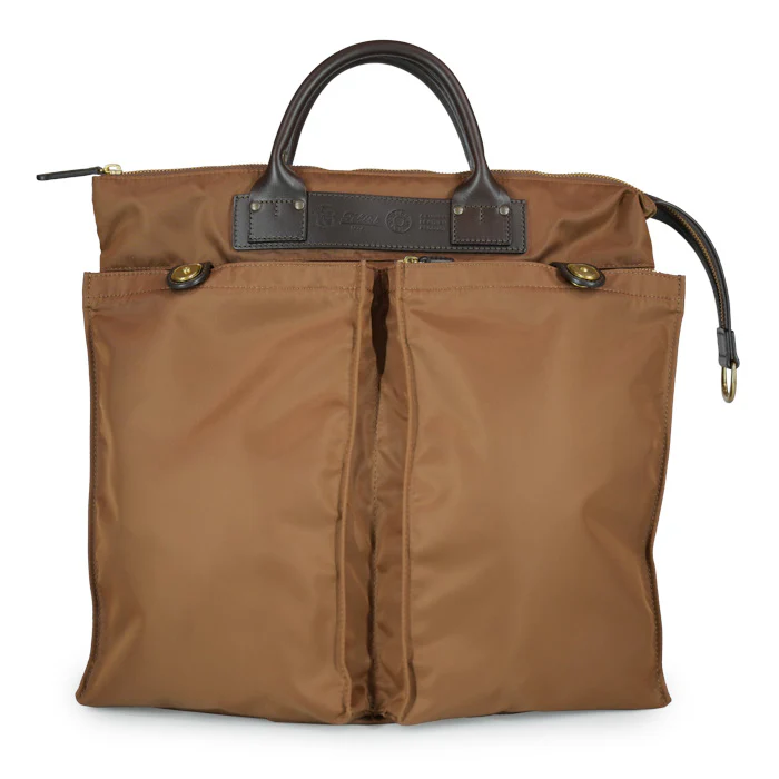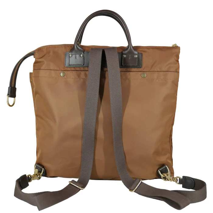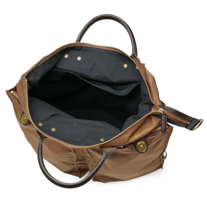 Realizzato in nylon tecnico di colore cacao e finiture in pelle di vacchetta resistente di colore marrone scuro