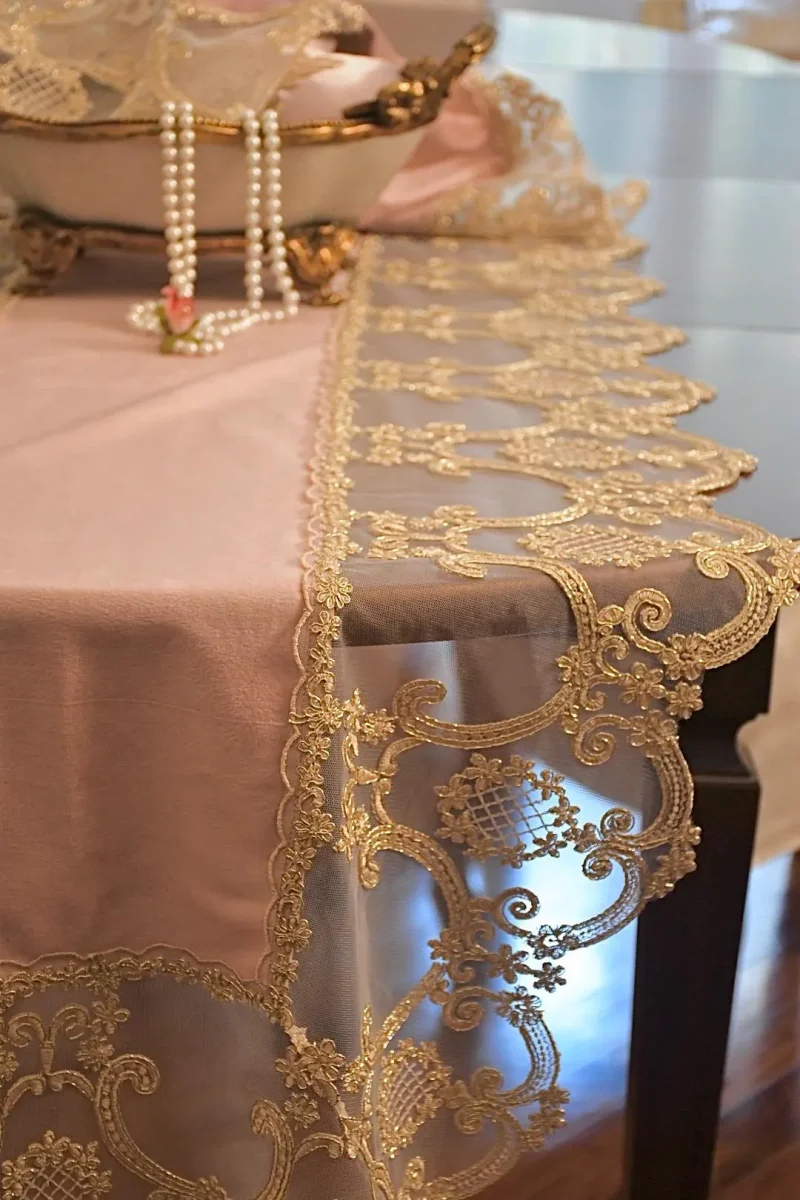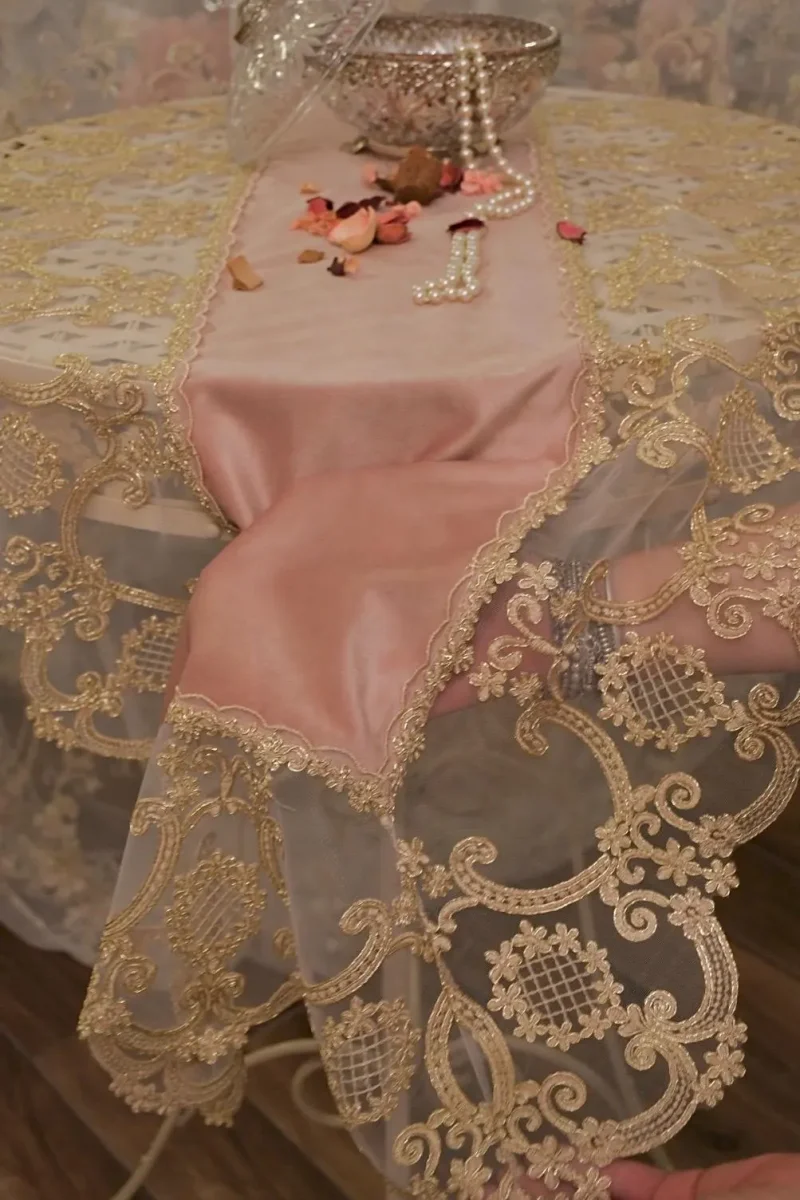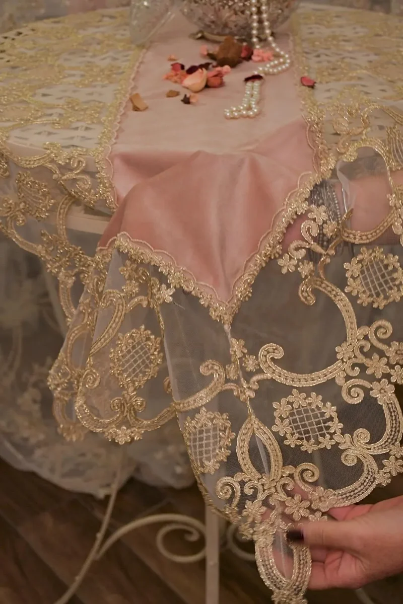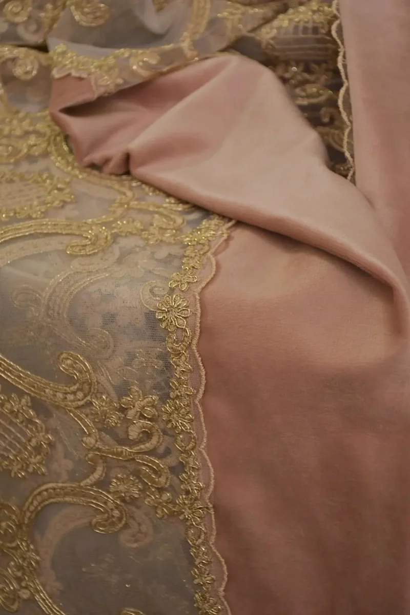 Il pizzo, caratterizzato da motivi intricati di ispirazione rinascimentale, è composto da eleganti arabeschi e piccoli dettagli floreali che si sviluppano su una base trasparente, creando un gioco di luce e ombra. Le linee sinuose e le forme classiche richiamano la bellezza dei decori antichi, mentre il tono dorato del pizzo si abbina perfettamente al fondo rosa, donando un aspetto regale e raffinato. Ogni dettaglio è curato con precisione, valorizzando la qualità dei materiali e l’abilità artigianale.