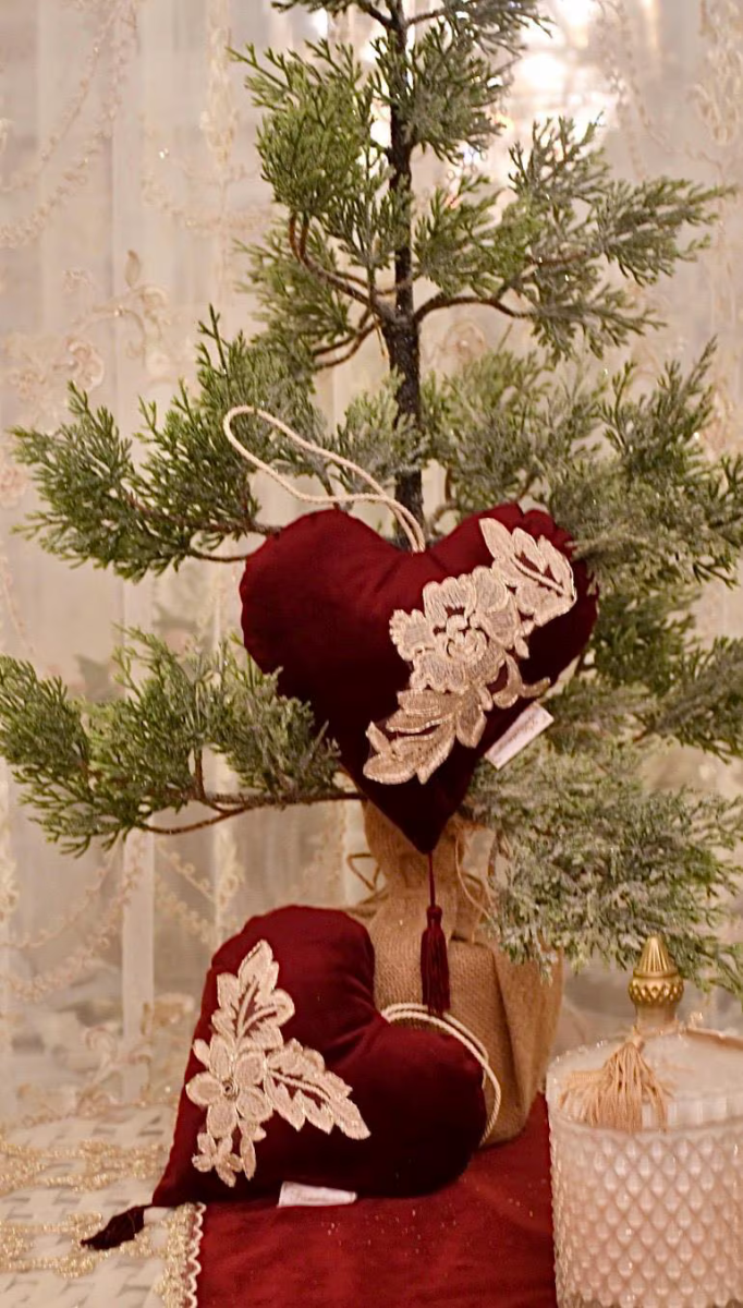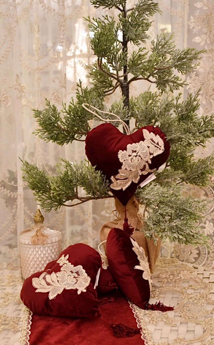 Questo set di cuori in velluto bordeaux e pizzo dorato è una scelta perfetta per chi desidera regalare un tocco di classe e raffinatezza, che possa essere apprezzato per anni, ogni Natale o per momenti speciali.