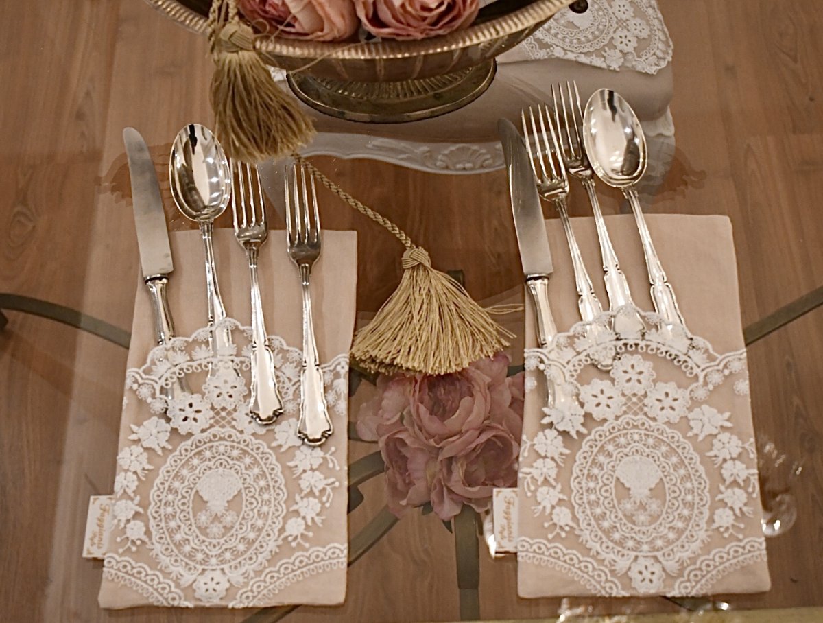 Set di 2 portaposate in puro Lino rosa e pizzo prezioso bianco .
