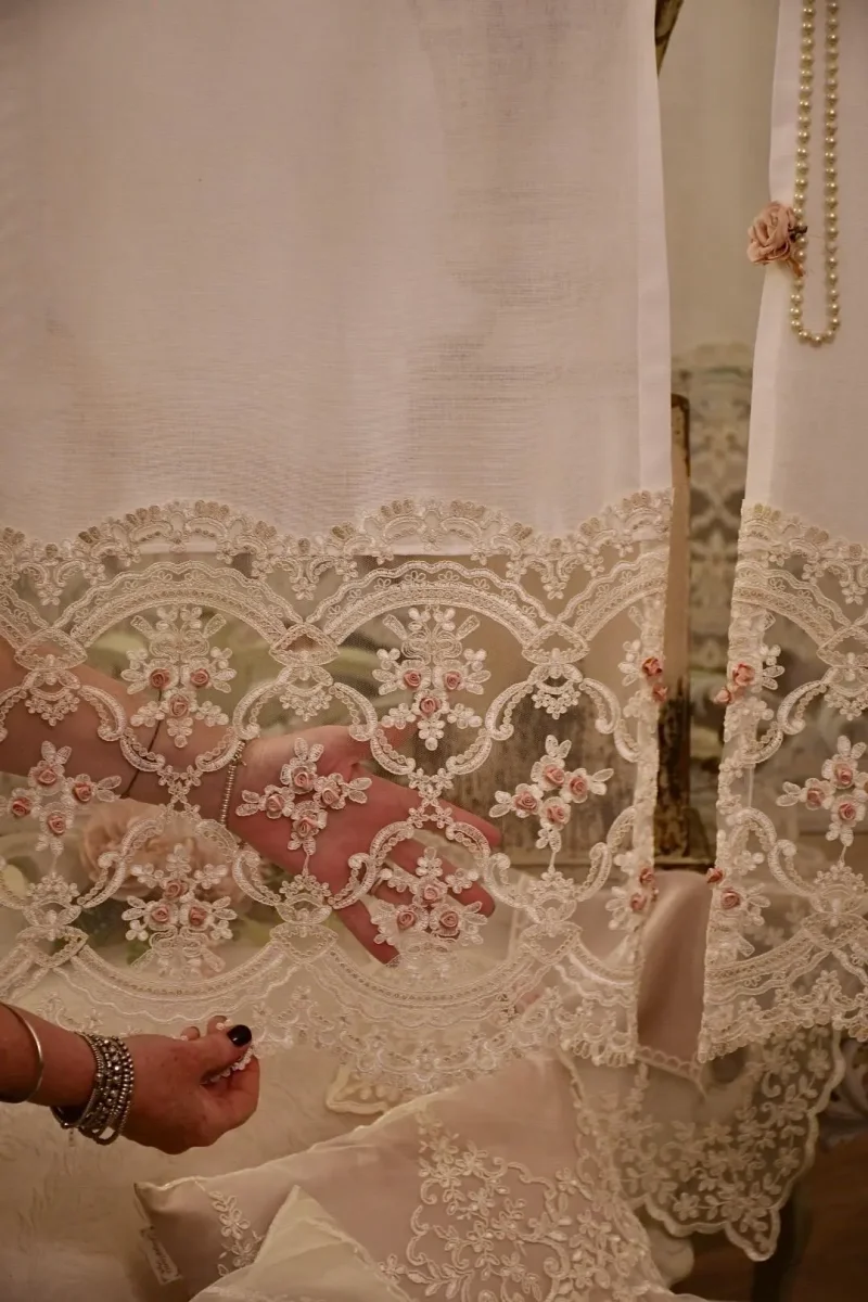 Il modello delle tendine è pensato per incorniciare con grazia la finestra, permettendo alla luce naturale di filtrare dolcemente attraverso il lino leggero, mentre il merletto nella parte inferiore aggiunge un elemento decorativo ricercato. Perfette per chi desidera arricchire le finestre con un dettaglio che unisce tradizione e modernità, queste tendine si prestano ad essere utilizzate sia da sole sia abbinate a tendaggi più pesanti per un effetto più strutturato.