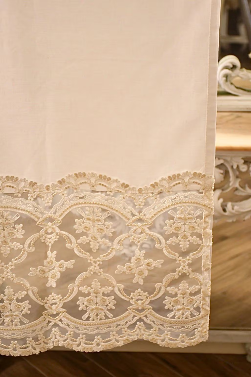 Il merletto è posizionato nella parte finale della tendina, donando un effetto elegante e raffinato. La parte finale della tendina è il preludio perfetto al pannello, collegando il design leggero della parte superiore a una base più decorativa.