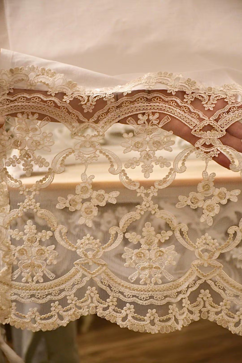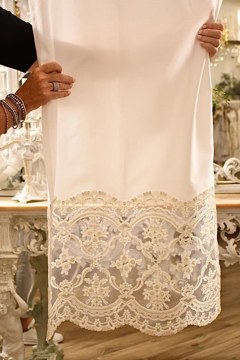 Queste tendine a vetro si inseriscono perfettamente in ambienti dallo stile classico, shabby chic, o romantico, donando un tocco di calore e delicatezza. La combinazione del Misto lino bianco con il merletto ricamato le rende ideali per finestre di cucine, salotti, camere da letto e persino bagni, dove si desidera mantenere luminosità .La parte inferiore della tenda è impreziosita da un elegante pizzo rebrodé, caratterizzato da un raffinato disegno a motivi floreali e arabeschi, con ricami in rilievo che conferiscono profondità e ricchezza tattile. Il pizzo, finemente lavorato, è arricchito da delicate roselline di raso applicate , in una tenue tonalità di rosa cipria, che donano un tocco romantico e sofisticato all’insieme. I piccoli fiori si inseriscono armoniosamente all’interno della composizione, creando un gioco di luce e texture che valorizza ulteriormente il bordo decorativo della tenda.