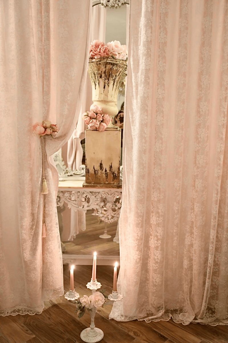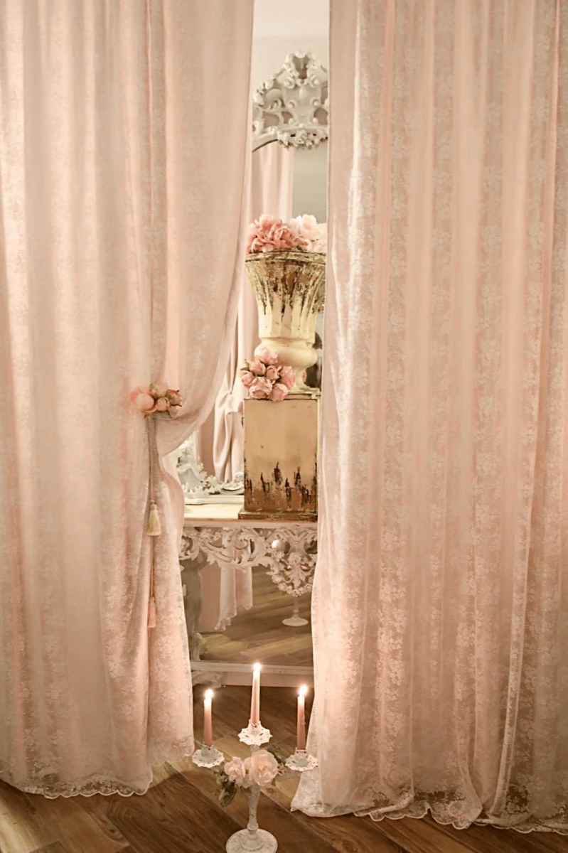 Ogni tenda è confezionata con cura, con pizzo chantilly leggero e raffinato dal bordo smerlato, abbinato a un morbido rasatello di seta rosa cipria che le dona corpo e struttura senza appesantirne l’estetica. Ideale per interni in stile romantico, shabby chic o classico, aggiungerà un tocco di fascino senza tempo a camere da letto, salotti o angoli lettura.