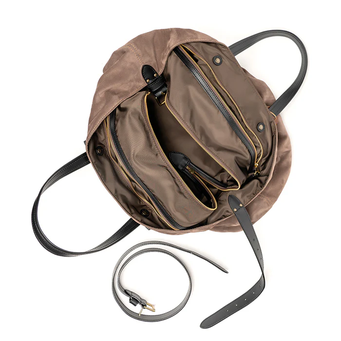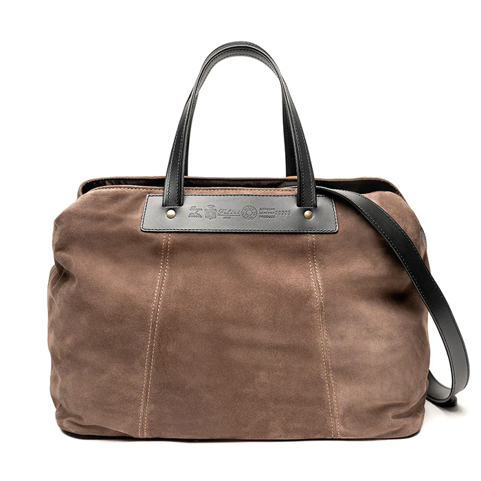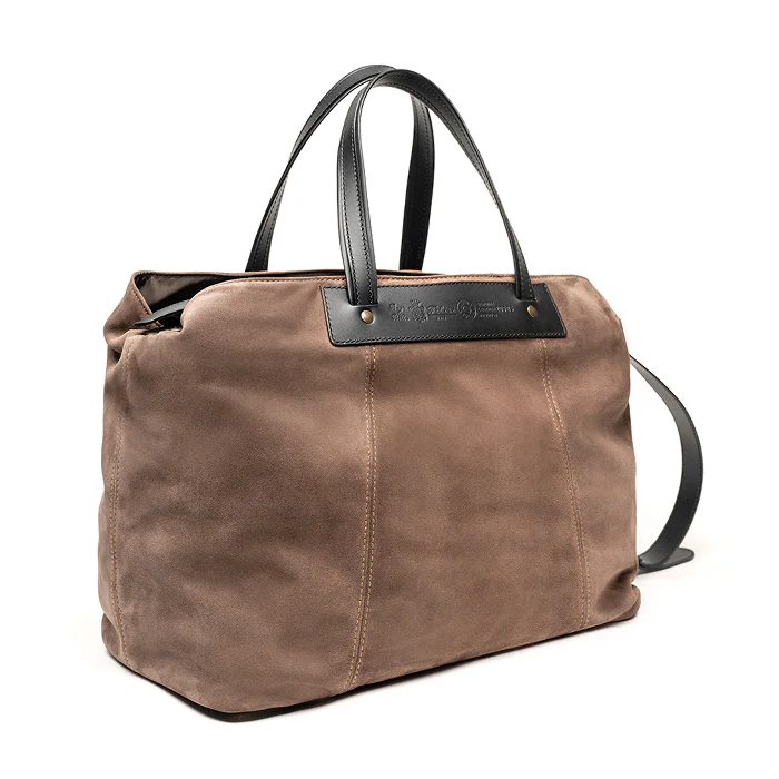 Valigia Felisi Timothy a mano e a tracolla realizzata in morbida pelle scamosciata di colore tortora con finiture in pelle di vacchetta colore nero.