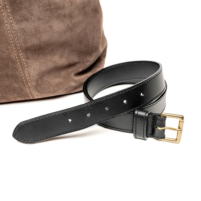 Tracolla regolabile in pelle di vacchetta nero e adattabile che all’occorrenza si sgancia e diventa una pratica cintura da indossare.