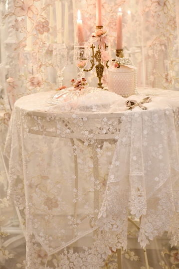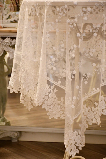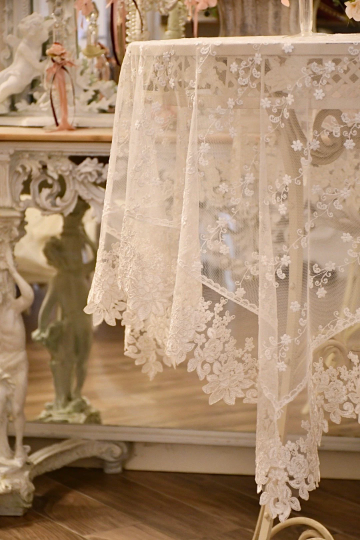 Tovaglia/copritavolo in pizzo decorato bianco , raffinato , elegante e pregiato .Il colore è un bianco seta dal sapore antico .Ha una trama sottile , morbida , con fantasia floreale di Rose .In fibra sintetica di derivazione naturale e quindi è ecosostenibile .In diverse misure