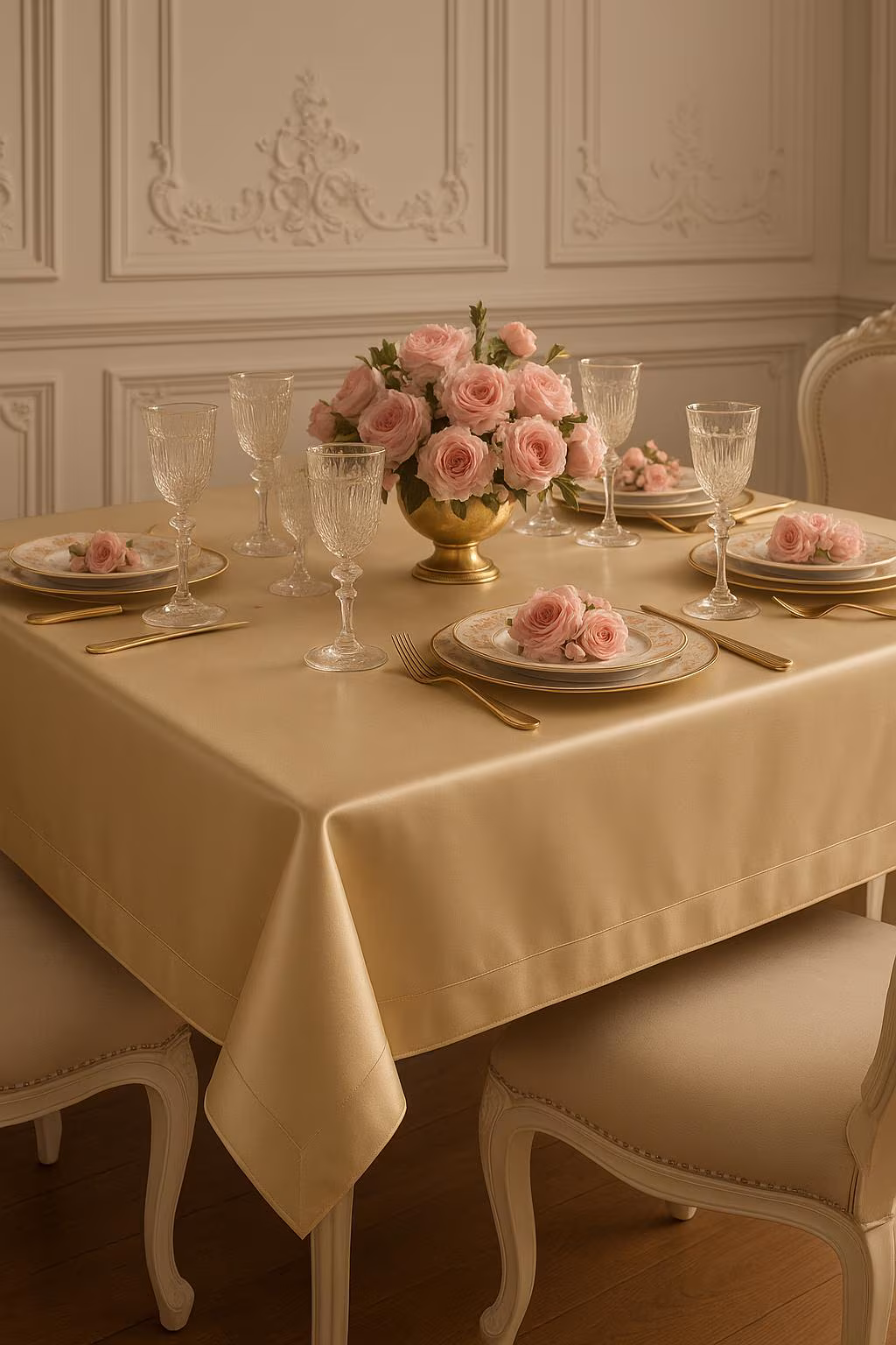 Copritavolo elegante in rasatello di cotone oro oppure avorio a scelta con particolare lavorazione ed angolo a 45 gradi. Per dare un tocco di raffinatezza, uno stile sempre nuovo e ricercato ai nostri ambienti, rendendoli chic con un semplice accessorio.