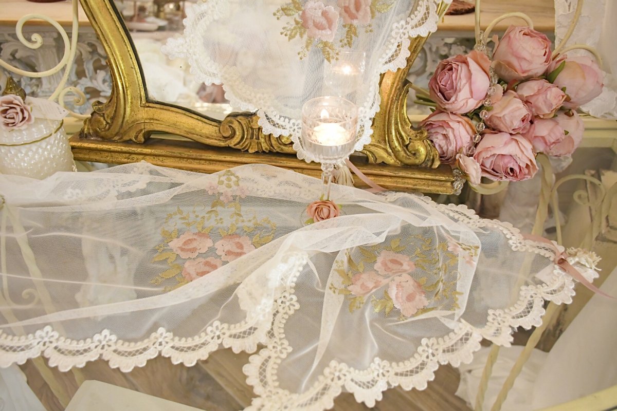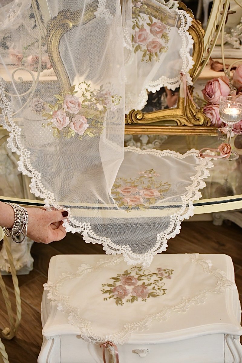 Delizioso raffinato tris di centrini per la camera da letto, per il soggiorno, per il bagno ecc.In tulle ricamato con rose leggero, morbido al tatto .