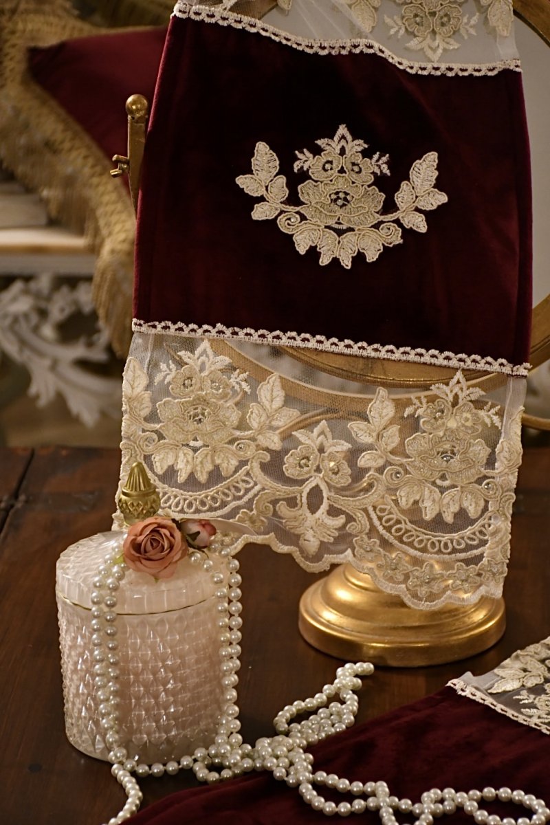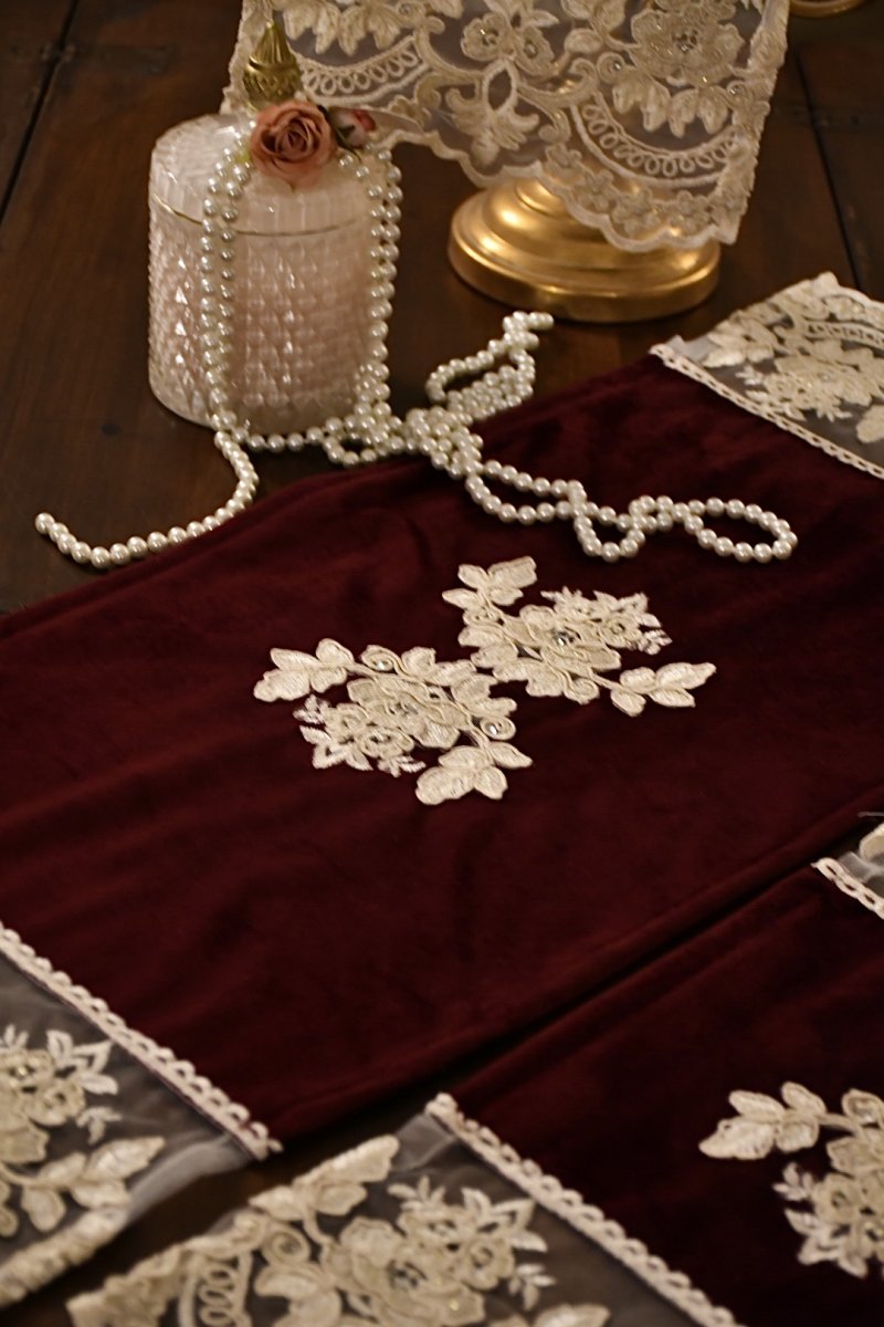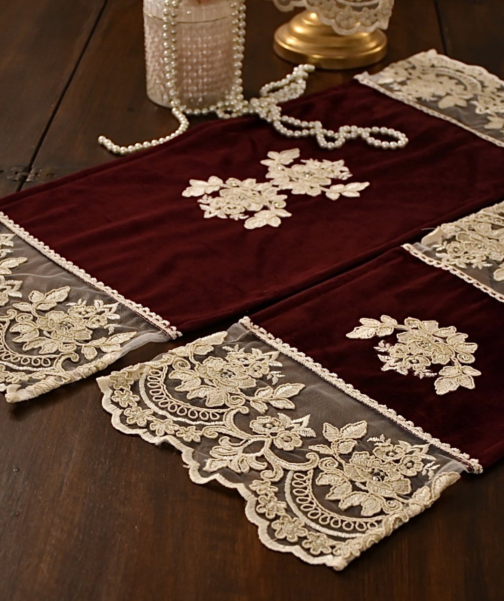 Delizioso e romantico tris di centrini per comò e comodini , in un delicato velluto bordeaux e merletto rebrodè avorio e rosa cipria.