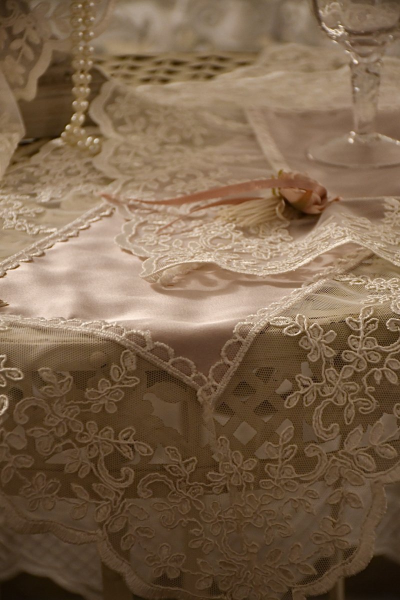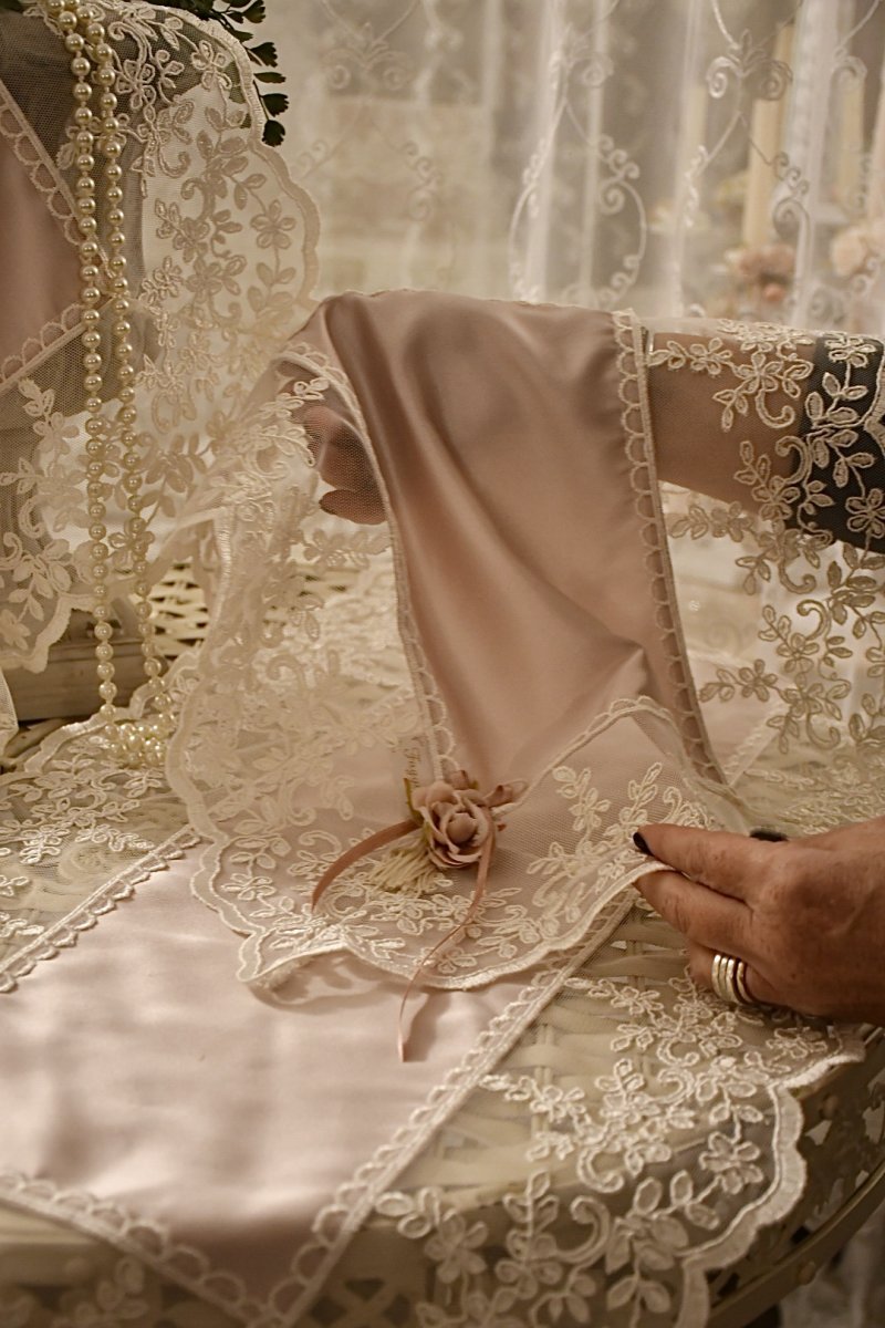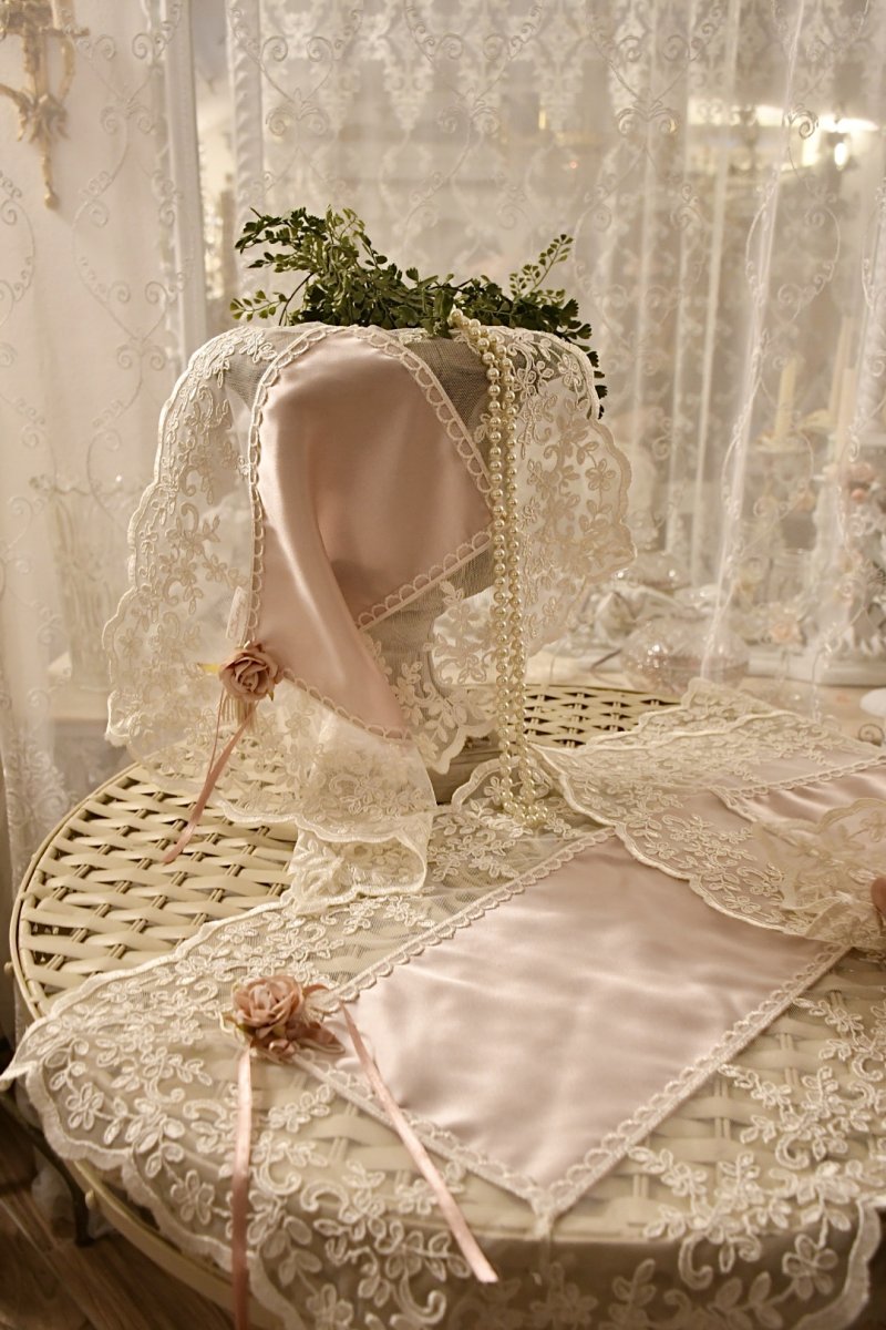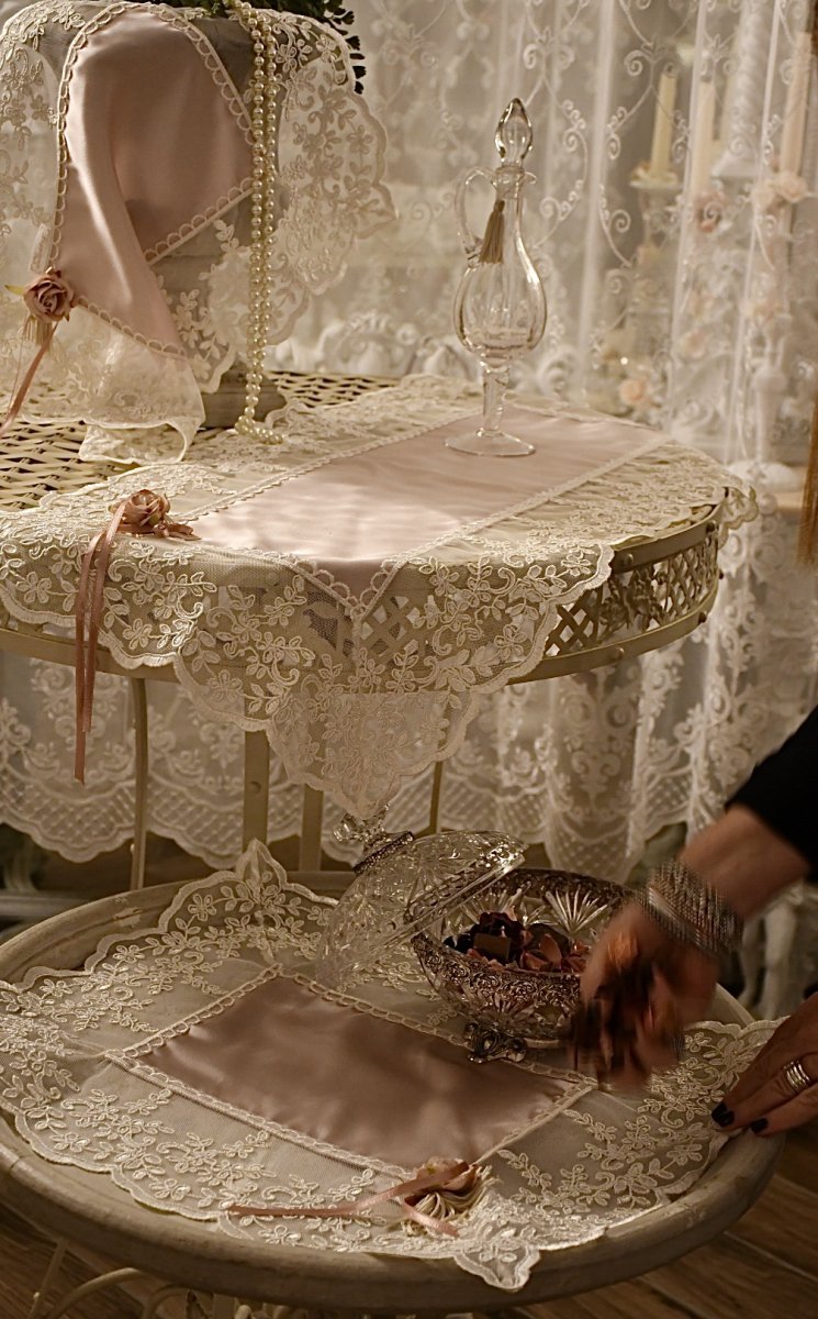 Questo raffinato set è composto da tre pezzi: un centro grande per il comò e due centrini più piccoli per i comodini, realizzati in pregiato raso di seta italiana color rosa delicato. Il tessuto, con il suo effetto cangiante, riflette la luce creando sfumature morbide e luminose, che conferiscono un tocco di romanticismo e raffinatezza a qualsiasi ambiente.